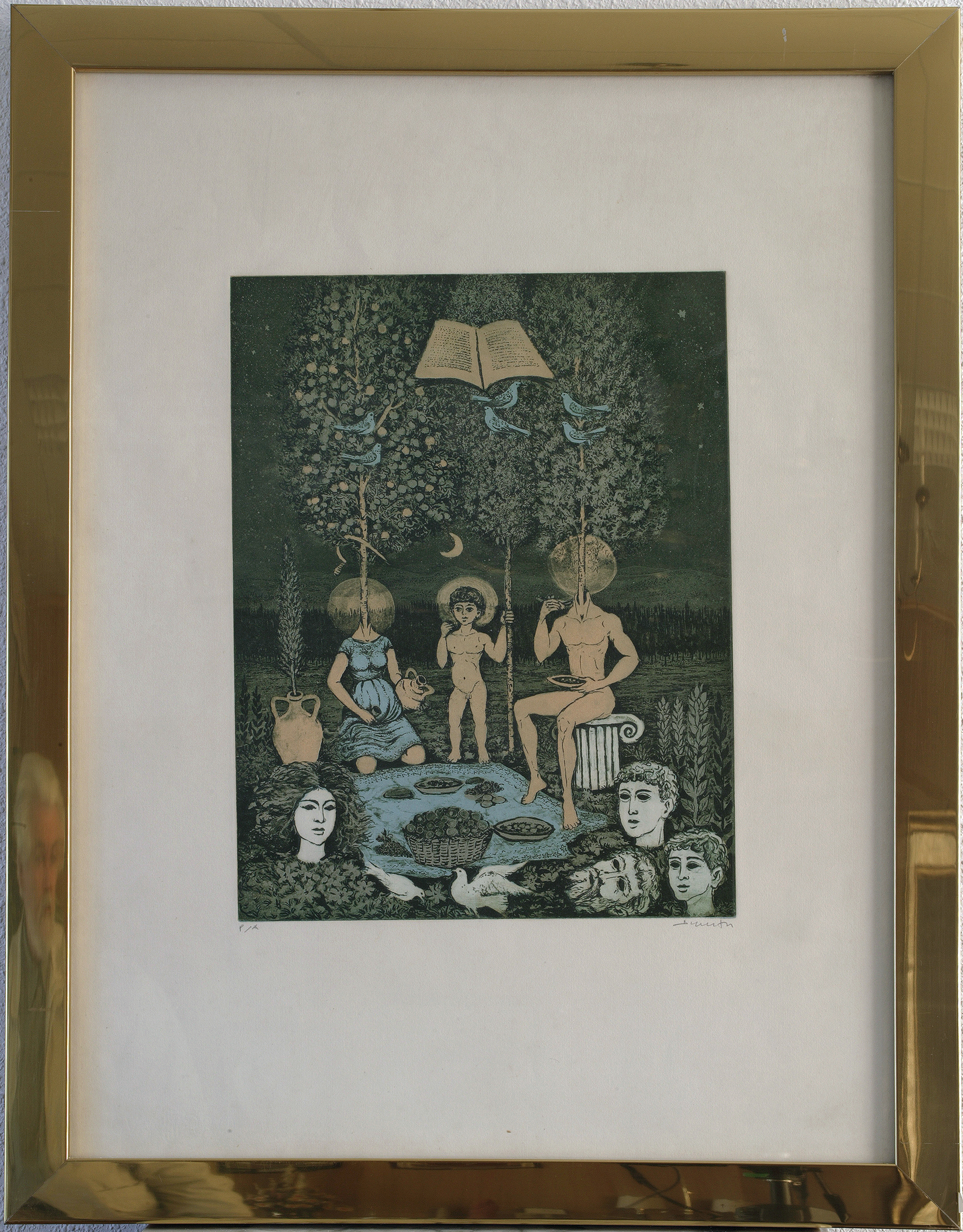 En torno al mantel, un capitel jónico sirve de asiento a una figura masculina desnuda que sujeta un plato con la mano izquierda, mientras que con la derecha parece llevarse la comida a la boca. El hombre no tiene cabeza, y en su lugar posee un árbol que brota de su cuello, desde donde también parte el trazo de una aureola. A su derecha, un niño desnudo con otra aureola alrededor de la cabeza, se agarra a otro árbol con la mano izquierda mientras que sujeta algo en la mano derecha, elevada y cerca de la cara. Completa el conjunto una mujer, arrodillada y cubierta por un vestido azul, que porta un cántaro en la mano izquierda y un vaso en la derecha. Al igual que la figura masculina está decapitada con un árbol frutal, una hoz y una aureola que se dibuja sobre su cuello. Junto a ella, un cántaro aloja en su interior otro árbol de porte inferior.