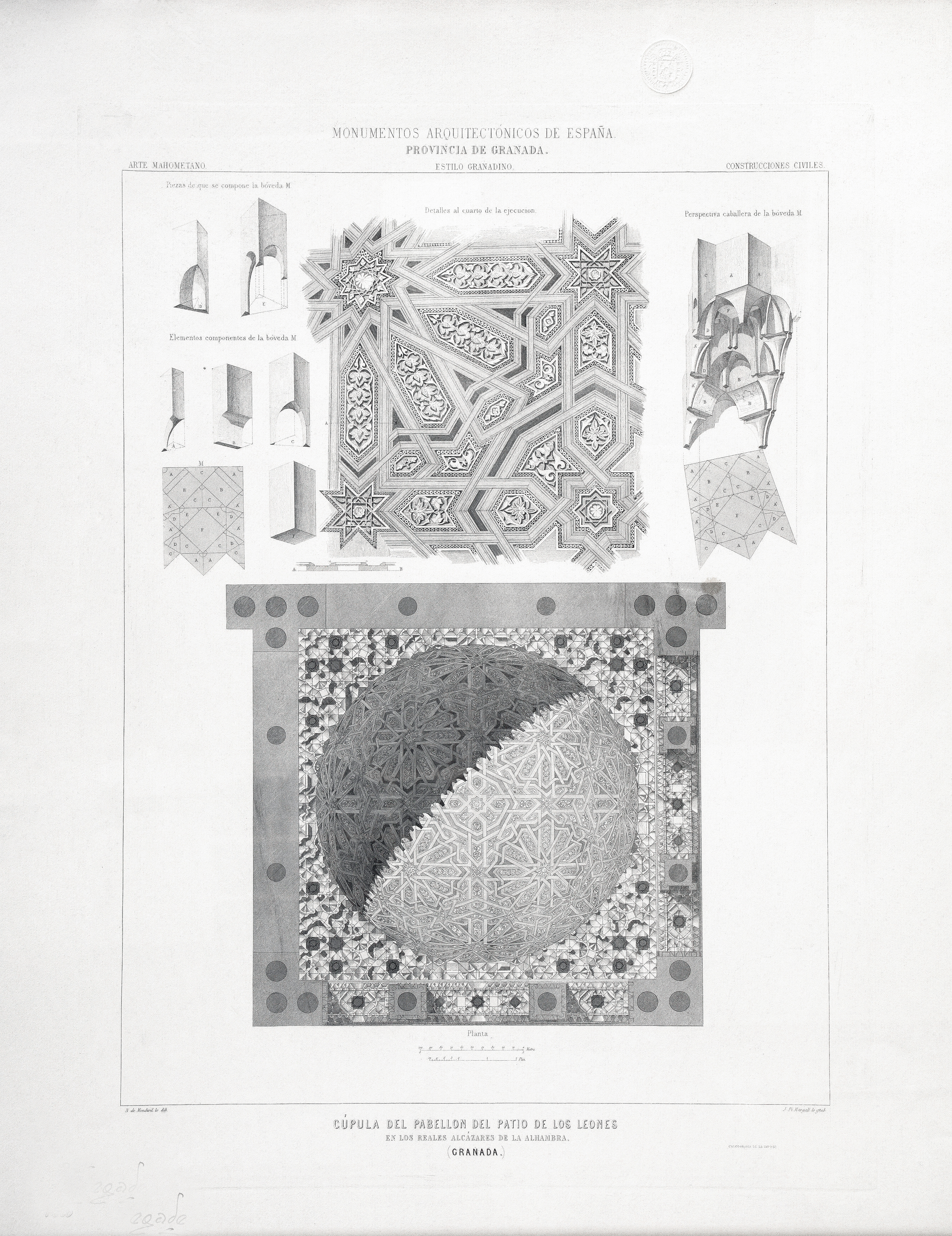 Litografía en blanco y negro con varios detalles de la cúpula y planta de uno de los dos pabellones del Patio de los Leones en la Alhambra de Granada. Arriba aparece la inscripción: MONUMENTOS ARQUITECTÓNICOS DE ESPAÑA// PROVINCIA DE GRANADA// ARTE MAHOMETANO/ ESTILO GRANADINO/ CONSTRUCCIONES CIVILES// Piezas de que se compone la bóveda M/ Detalles al cuarto de la ejecución// Perspectiva caballera de la bóveda M.// Planta// CÚPULA DEL PABELLON DEL PATIO DE LOS LEONES// EN LOS REALES ALCÁZARES DE LA ALHAMBRA.// (GRANADA.)