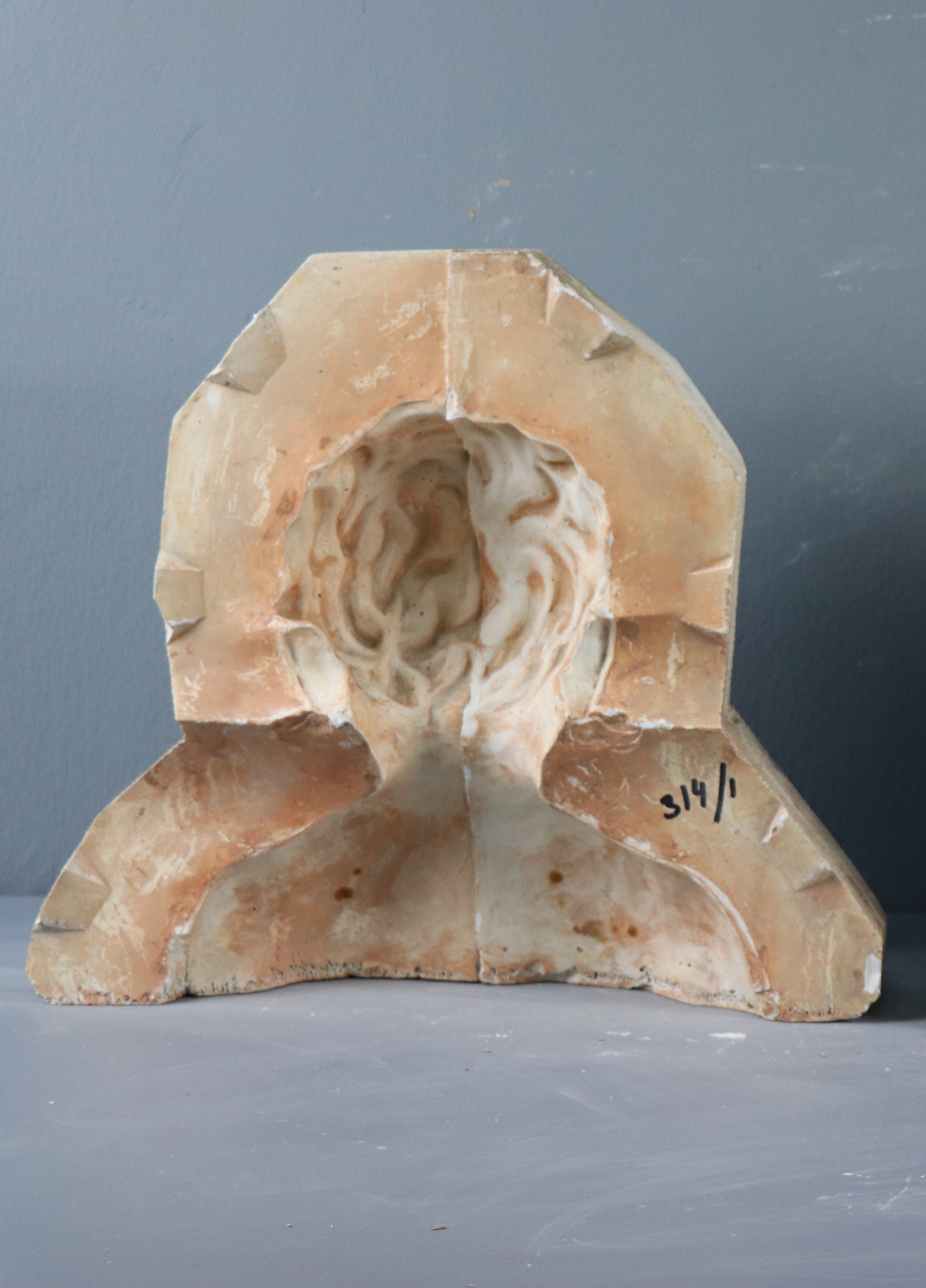 Este molde es el vaciado en escayola del busto del “Primo Pepito” (pieza CAM00013.00). Está formado por varios fragmentos que componen la silueta del busto de “Pepito”, donde se aprecia el cuidadoso y minucioso estudio de las proporciones anatómicas para infundir el máximo naturalismo a la figura.