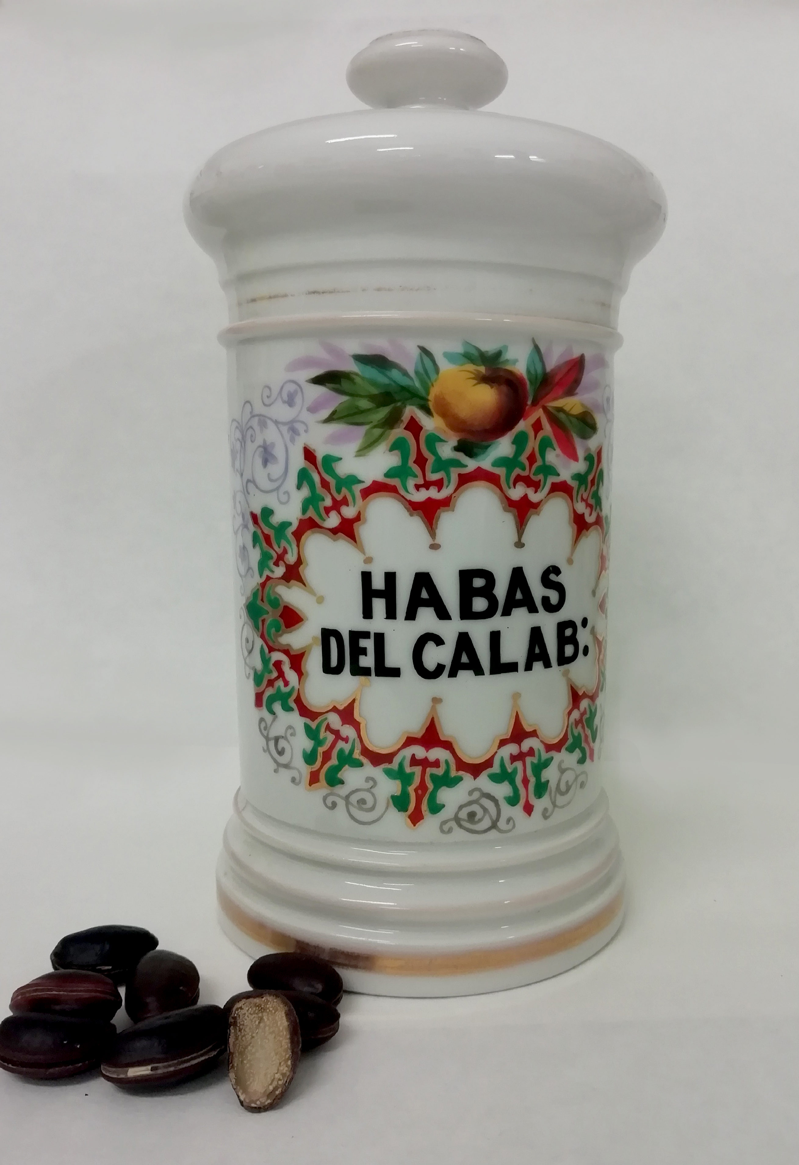 En el caso de estos últimos, la cartela, pintada sobre el propio albarelo, sigue una estructura ovalada en cuyo centro aparece, en negro y en mayúsculas, el nombre de su contenido “HABAS/DEL CALAB” (habas del Calabar o nuez de Eseré); lo rodea una cenefa decorativa de aire arabesco con decoración vegetal esquemática en rojo minio y azul verdoso perfilada en dorado. En los huecos generados por esta orla hacia el exterior, en su mitad inferior, se intercalan una serie de motivos vegetales aislados de trazo muy fino en tono dorado grisáceo y, en los extremos superiores se desarrollan en una mayor estructura de ramas, hojas y flores de color violeta tenue. Centrado sobre la cartela, un motivo vegetal formado por lo que parece ser una naranja con hojas en abanico a ambos lados remata la composición.