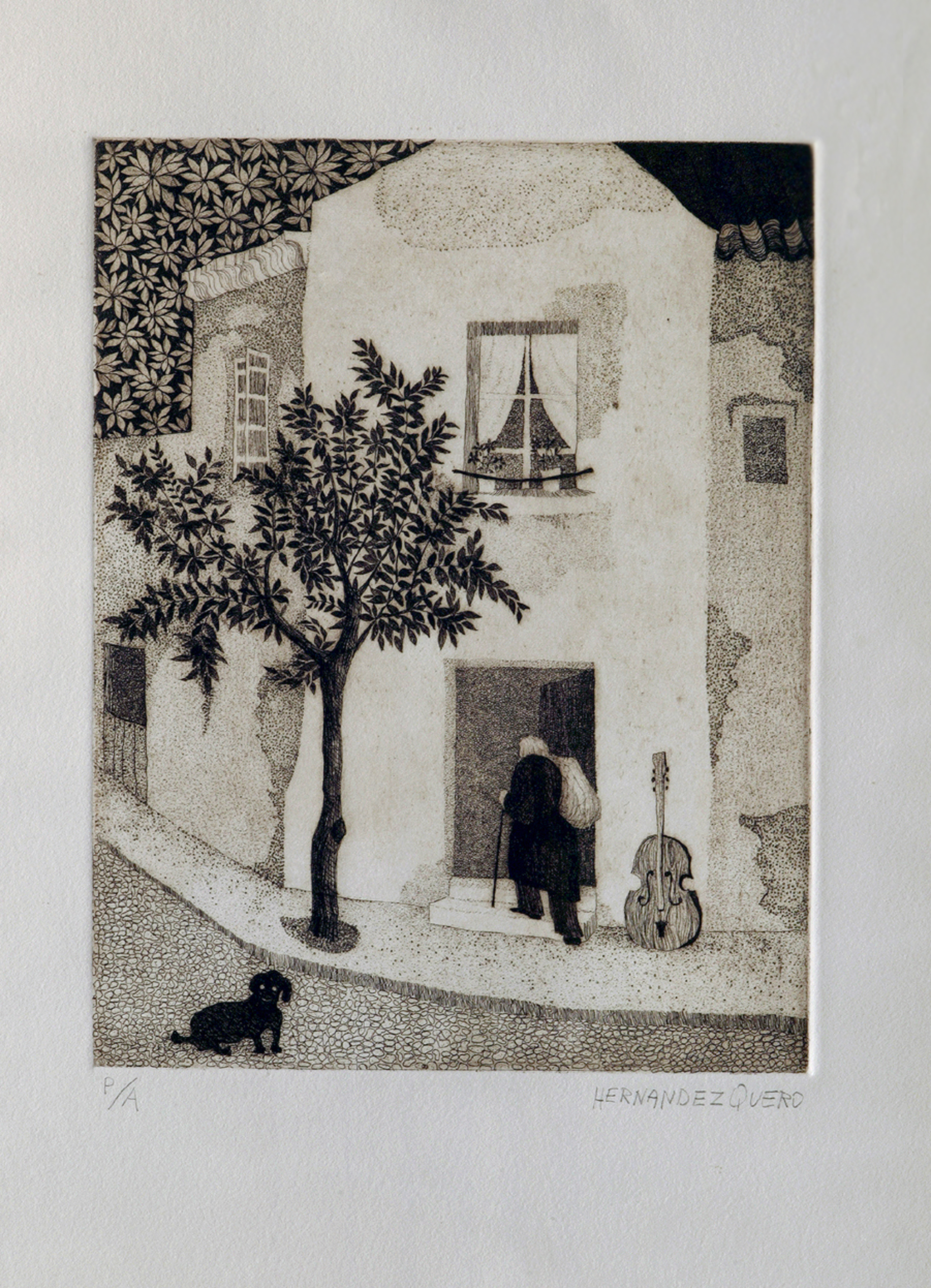 La escena presenta la esquina de una calle, concediendo total protagonismo a una casa de dos plantas y fachada encalada, a la que accede un anciano vestido de oscuro con un bastón en la mano izquierda y un saco claro al hombro. Enmarcan el vano de acceso de la casa, un contrabajo en el lateral derecho y un esbelto árbol de tronco y hojas oscuras, mientras que en en primer término, un pequeño perro negro dirige su mirada al espectador introduciéndolo en la escena.