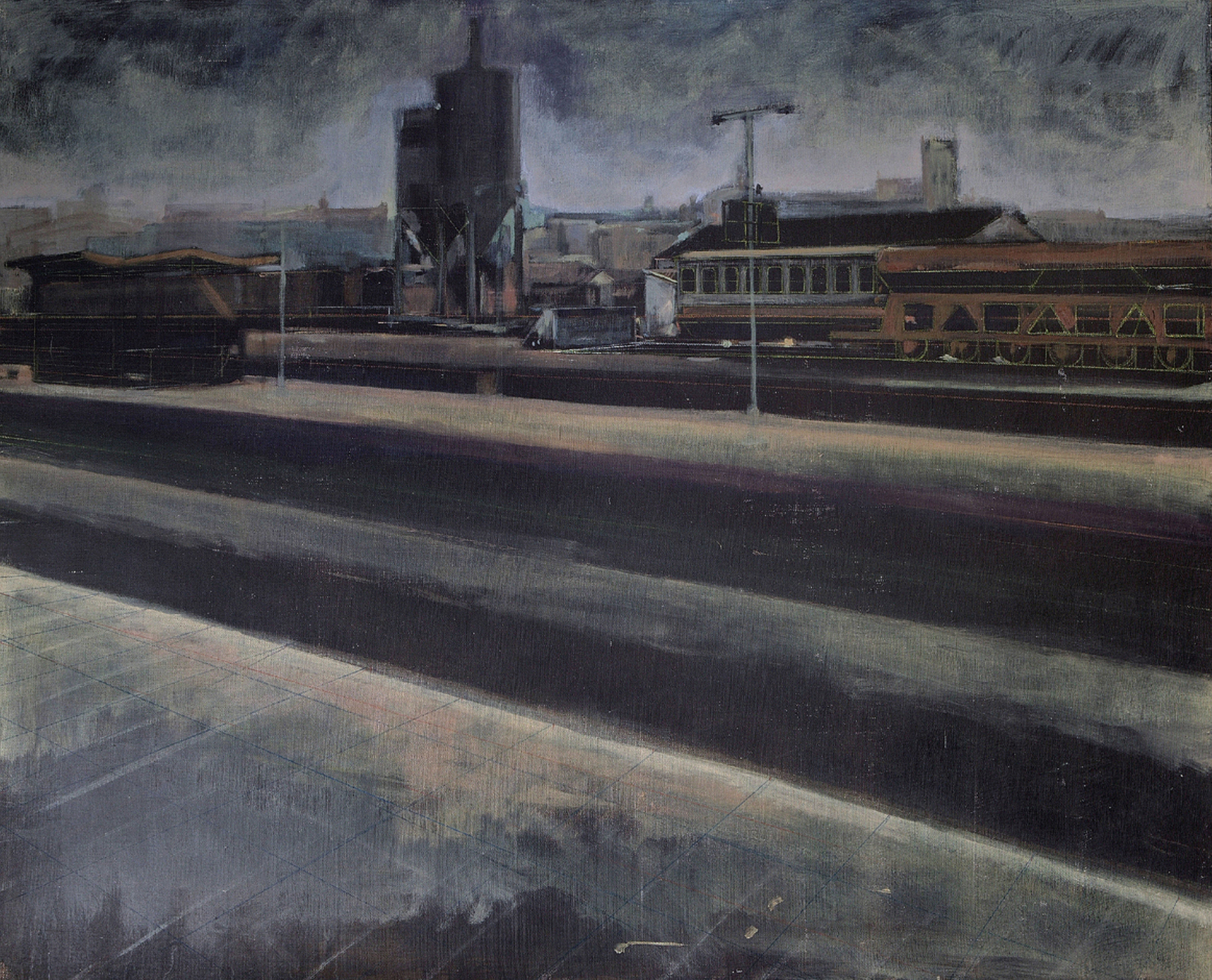 Este paisaje urbano representa una vista de una estación de ferrocarril desde la parte de atrás. Las vías y vagones quedan a media distancia mientras que los edificios de la ciudad se pierden en el horizonte bajo un cielo gris y oscuro que dicta la gama cromática, prácticamente monócroma en escala de grises. La pincelada es bastante suelta y se combina con delineados decididos y rectos que fugan, al menos en el caso de las vías y aceras, en un mismo punto.