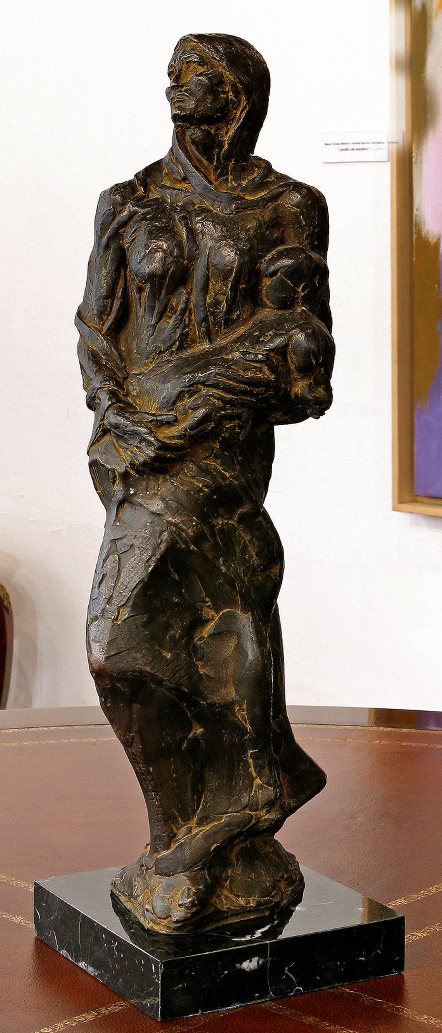 Escultura de bronce de pequeño formato. Representa a una figura femenina en pie que sostiene a su hijo entre los brazos. La estilizada figura y alargadas proporciones de la mujer son enfatizadas por la túnica y el largo velo que la visten, pegándose al busto para marcar los senos. La cabeza ladeada insinúa la mirada alzada y lateral.
