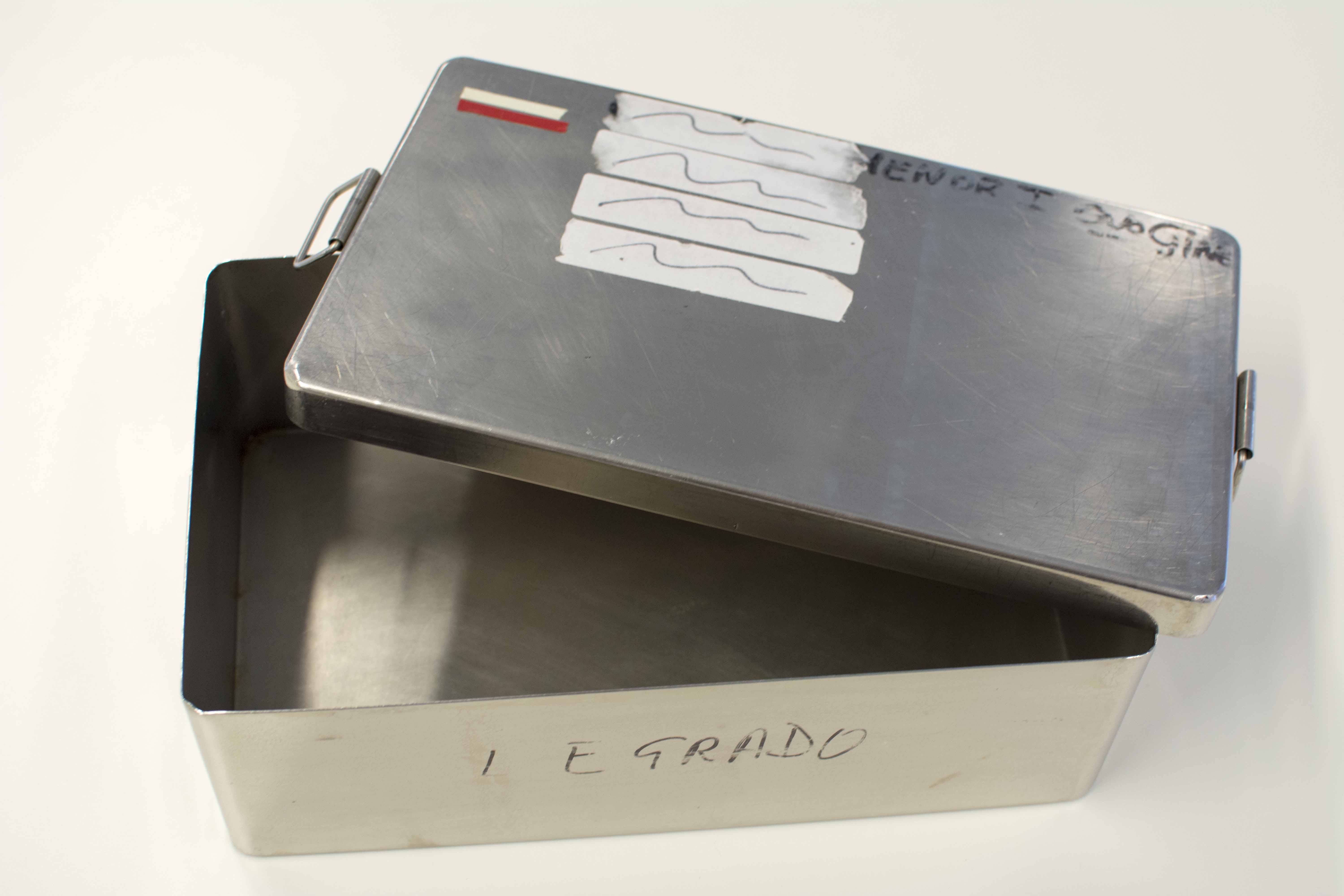 Caja rectangular con esquinas redondeadas y tapadera independiente de cierre a presión, realizada en acero inoxidable y utilizada para contener material estéril en su interior. La tapadera presenta asas móviles, realizadas en tubo de acero, en los laterales más estrechos.
