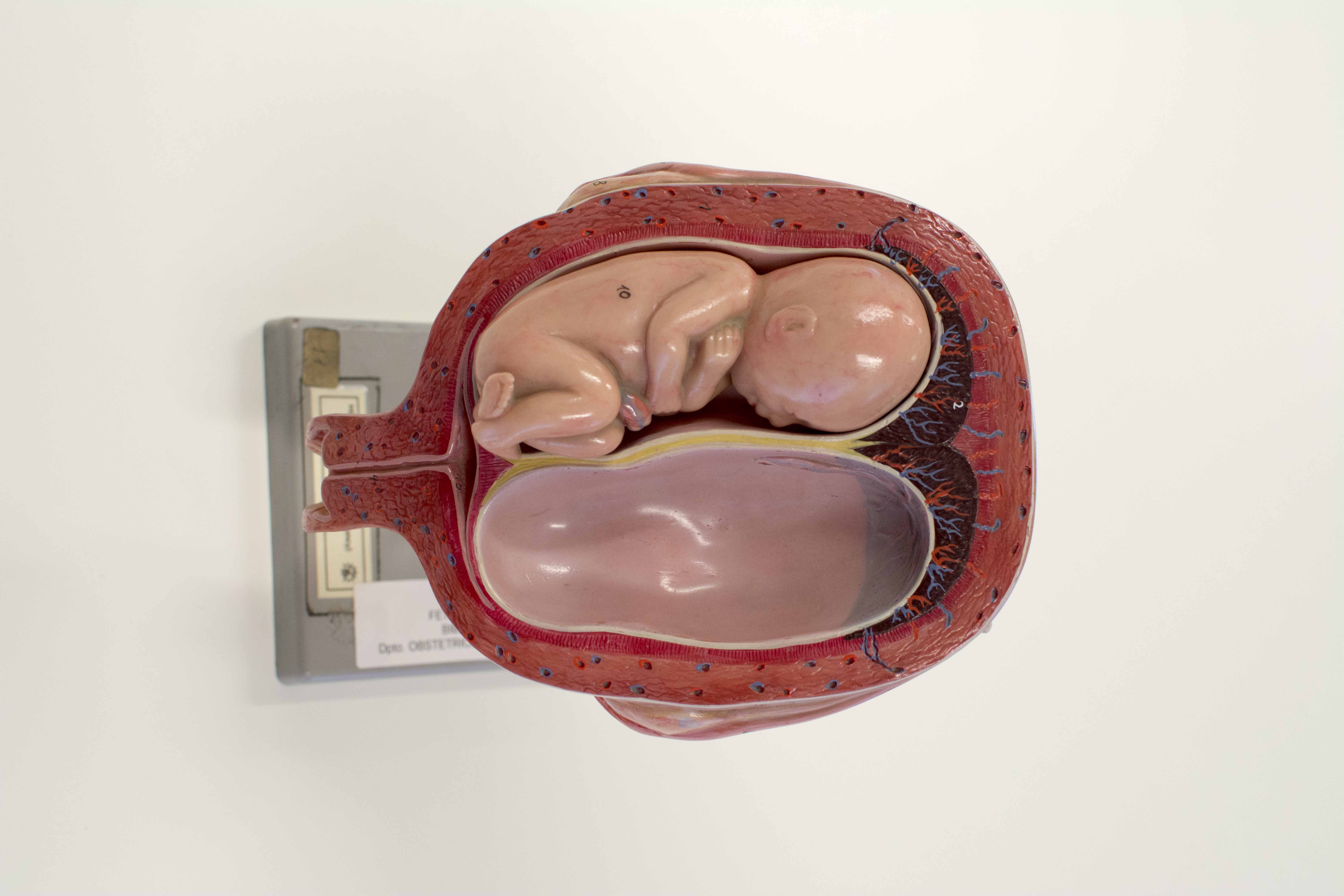 Modelo anatómico realizado en caucho coloreado, sobre peana de metal. Reproduce de forma realista el esquema de la cavidad fetal. Únicamente conserva uno de los dos fetos, presentando vacío el hueco en el que reposaría el segundo. Las paredes del útero se recrean con gran verismo, mostrando capilares sanguíneos y diferentes tejidos.