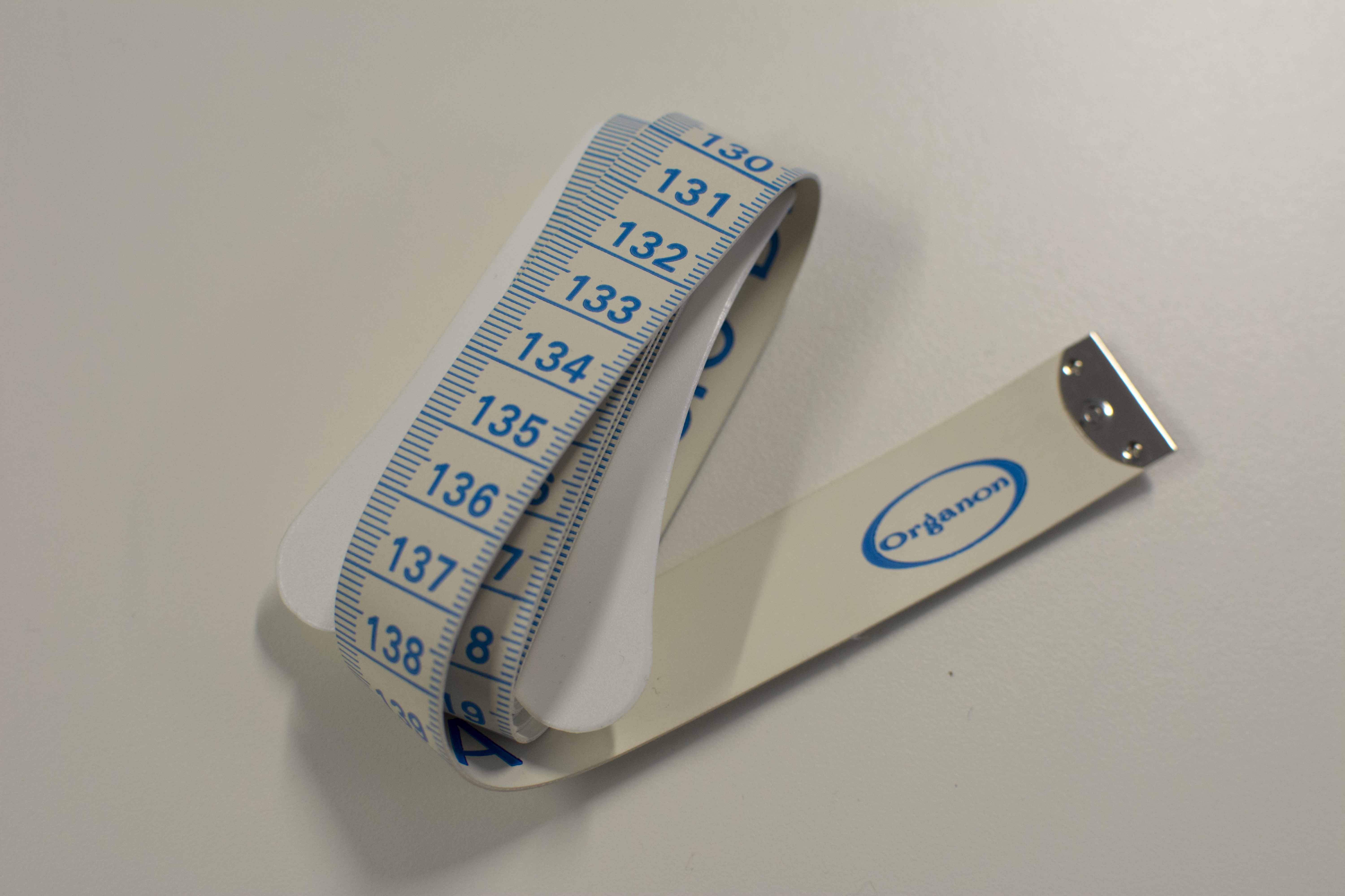 Cinta métrica blanca con numeración azul, utilizada en la consulta del obstetra y el ginecólogo para la medición del contorno de la mujer embarazada.