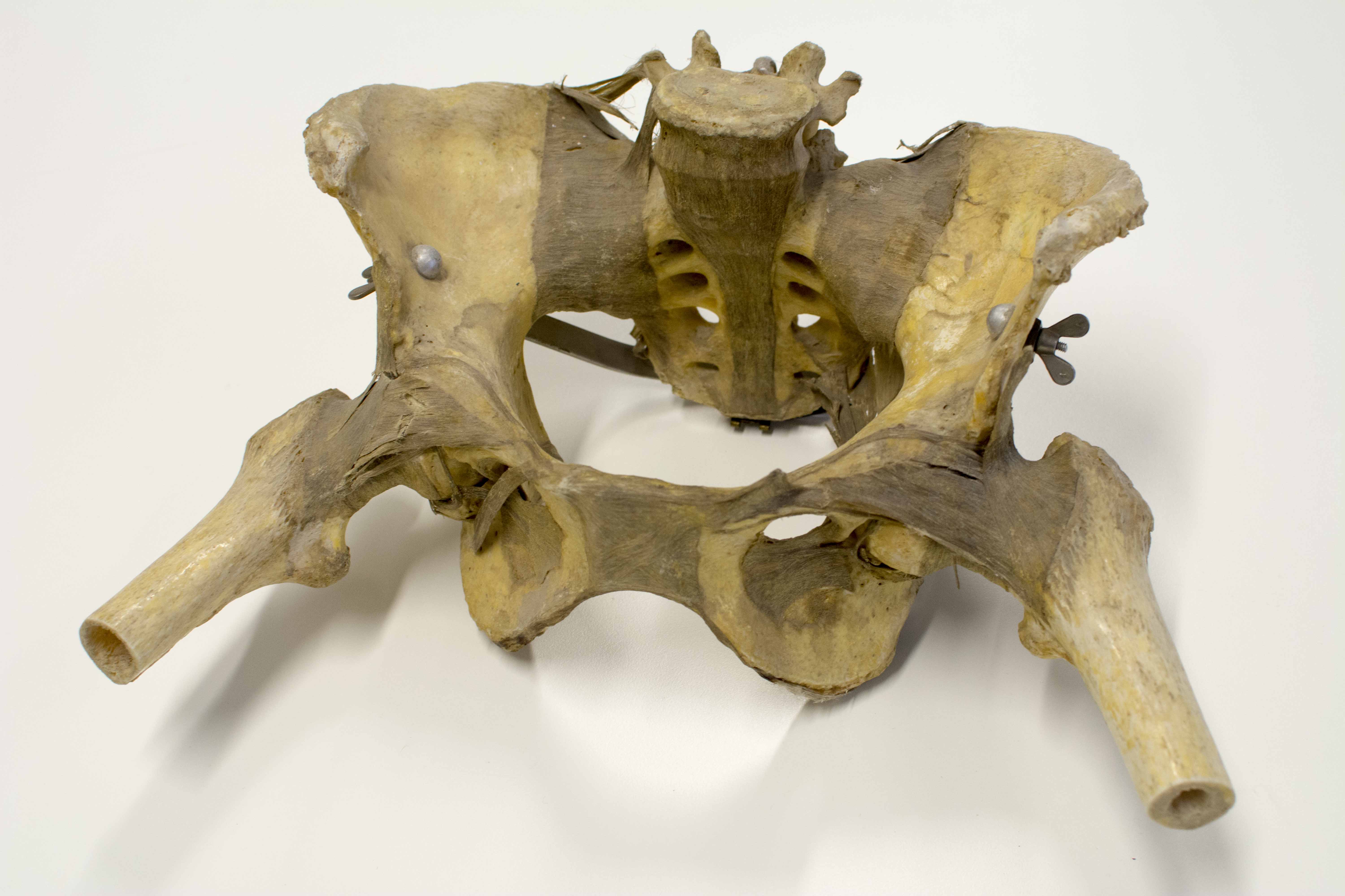 Pelvis humana conectada a los fémures. Presenta restos de tejidos blandos disecados y anclajes metálicos de refuerzo.
