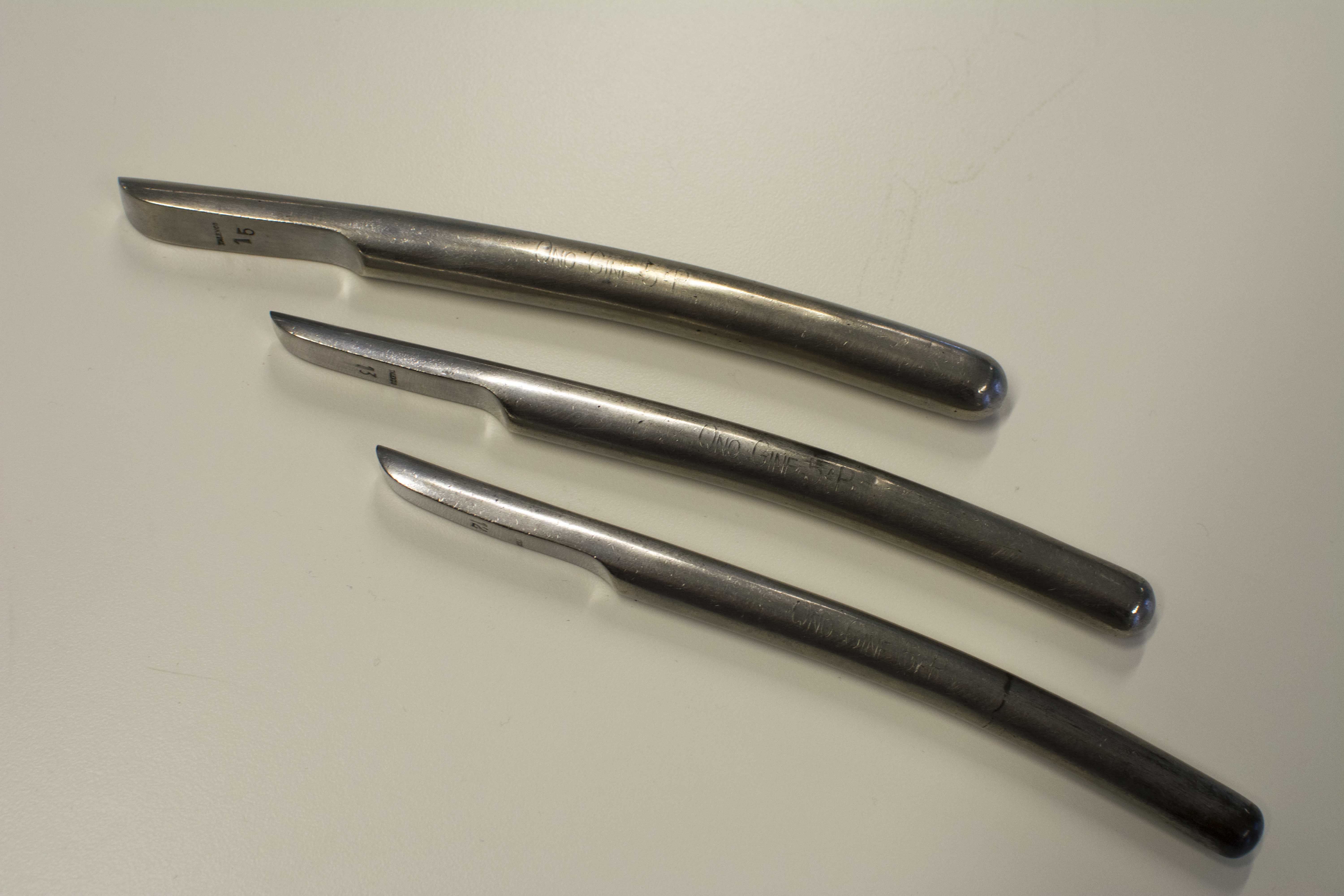 Conjunto de tres dilatadores Hegar realizados en acero inoxidable. Cada uno de ellos cuenta con un extremo ligeramente abombado y el opuesto, con forma de lengua, especifica la numeración correspondiente al tallaje concreto de cada pieza.