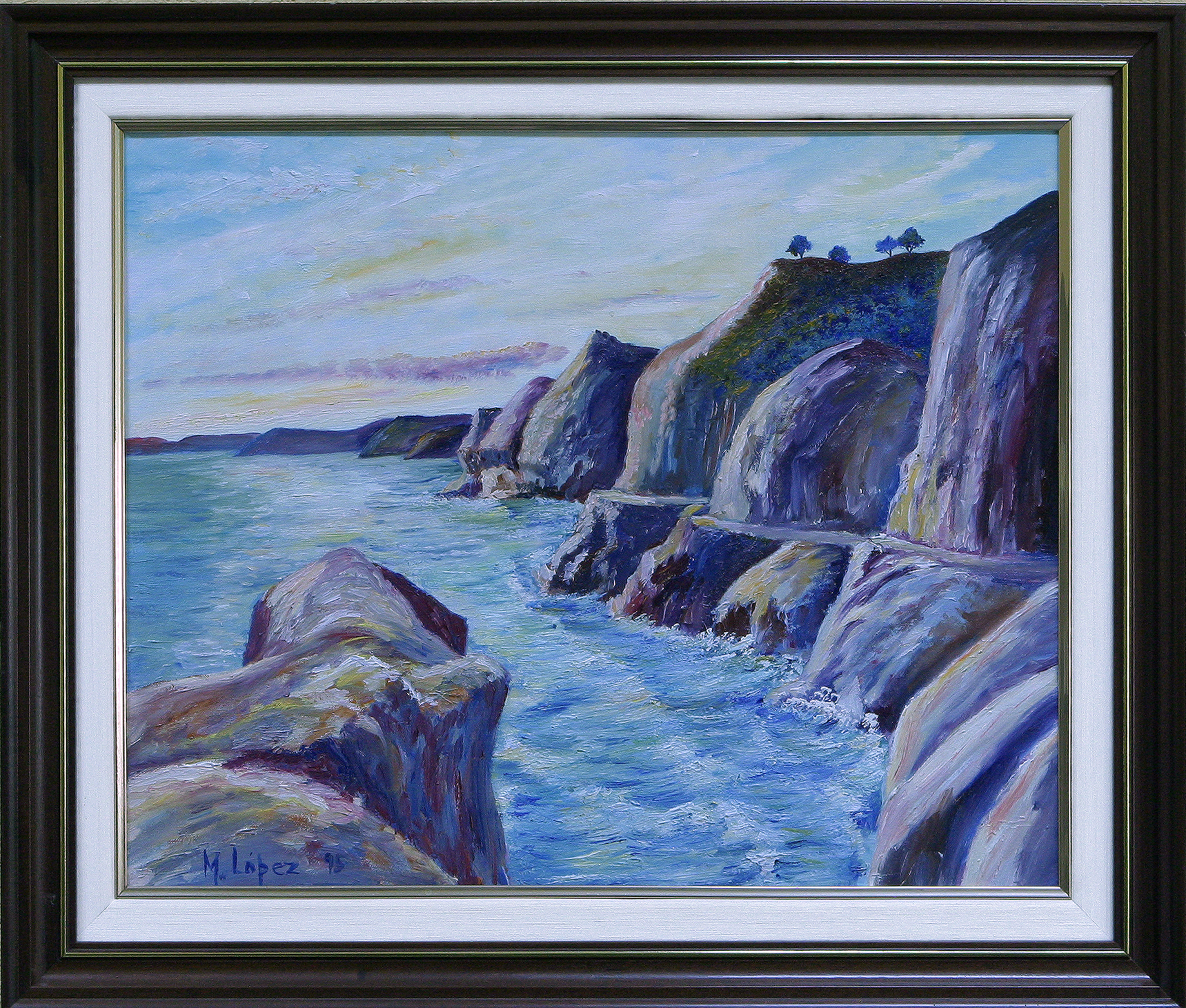 La paleta cromática de tonos fríos incide en los azules del mar y el cielo, tiñendo también las áreas de tierra. El resultado es de notoria simplicidad técnica y formal, de pincelada pastosa y poca armonía de color. Posee otra inscripción al dorso en azul, "ACANTILADOS / R.M. López 1995".