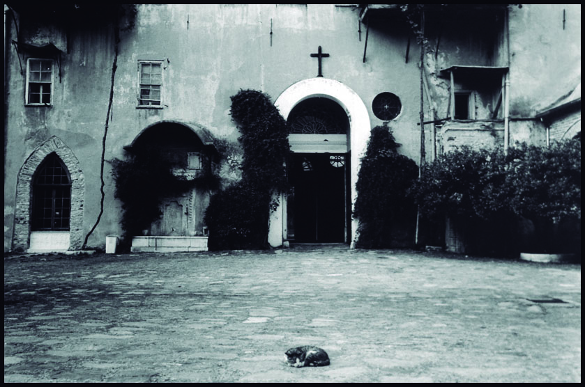 La fotografía, en blanco y negro, nos muestra el patio central del Monasterio de Iviron, en el Monte Athos. Se aprecia vegetación a ambos lado del acceso a ese patio, coronado por la cruz, mientras un pequeño gato reposa y duerme en mitad del mismo.