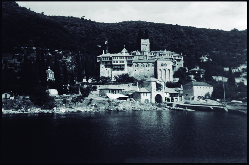 La fotografía, en blanco y negro, nos muestra una panorámica del Monasterio de Docheiariou, en el Monte Athos, ubicado a su vez junto a una bahía y rodeado por árboles y montañas.