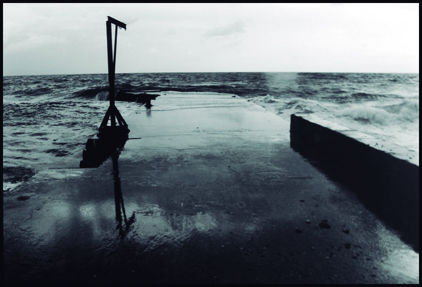 Vemos una imagen del Puerto del Monasterio de Xenophontos, donde la composición se encuentra totalmente dominada por la presencia del agua del mar, pudiendo apreciar además una especie de pasarela central, así como una estructura en el lado izquierdo.