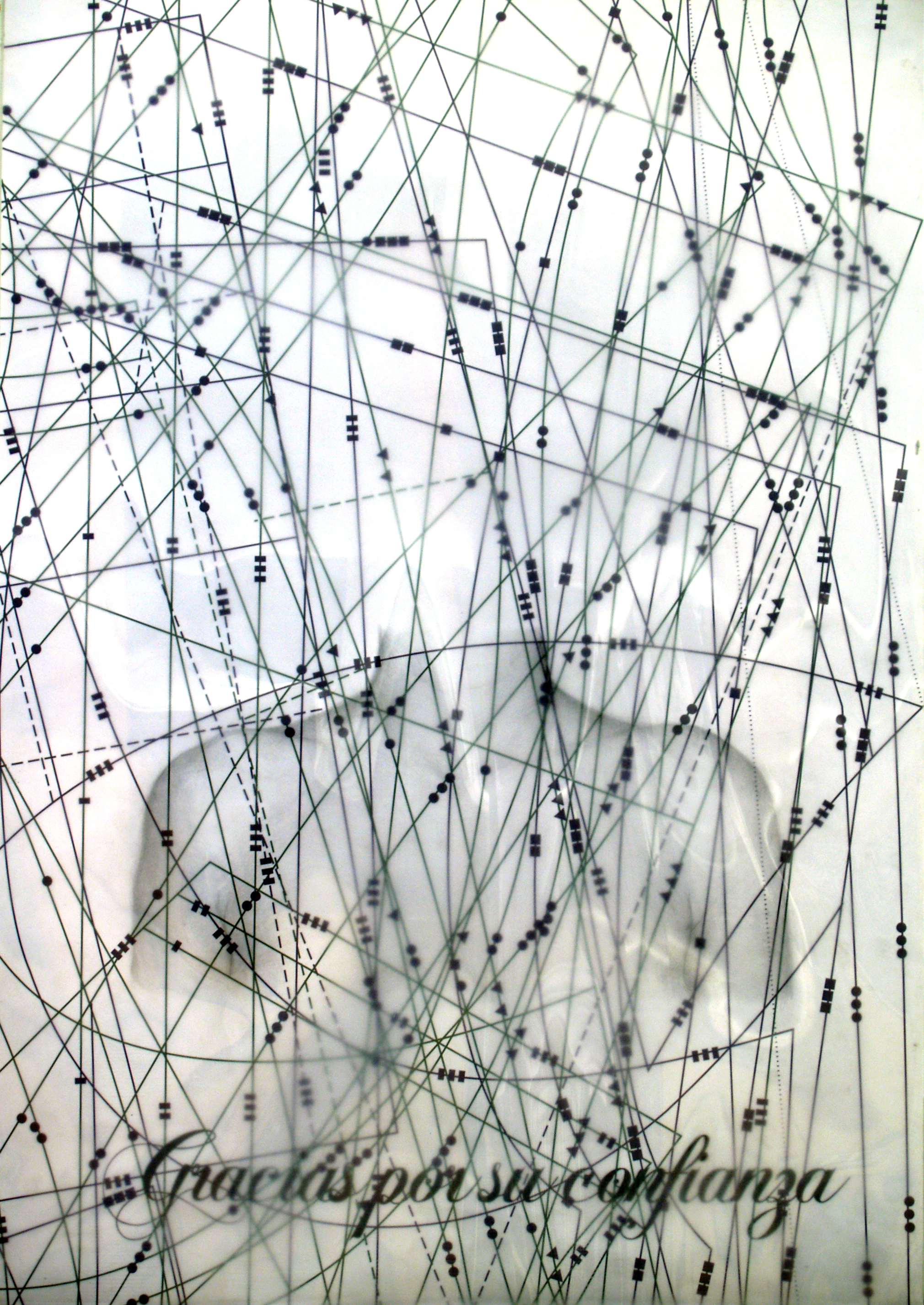 Lara Salinas Alejandre hace uso de dos técnicas asociadas a tradiciones artísticas diferentes para generar una obra de complejidad simbólica. Utilizando el grafito reproduce delicadamente el torso de una figura humana, desdibujando el trazo al llegar a la parte superior del cuello y antes de alcanzar el pecho, mientras que superpone a esta un entramado irregular de líneas cruzadas entre sí, marcadas con formas geométricas sólidas, rematando el conjunto en letra preciosista de tipo Bickham con la frase "Gracias por su confianza".