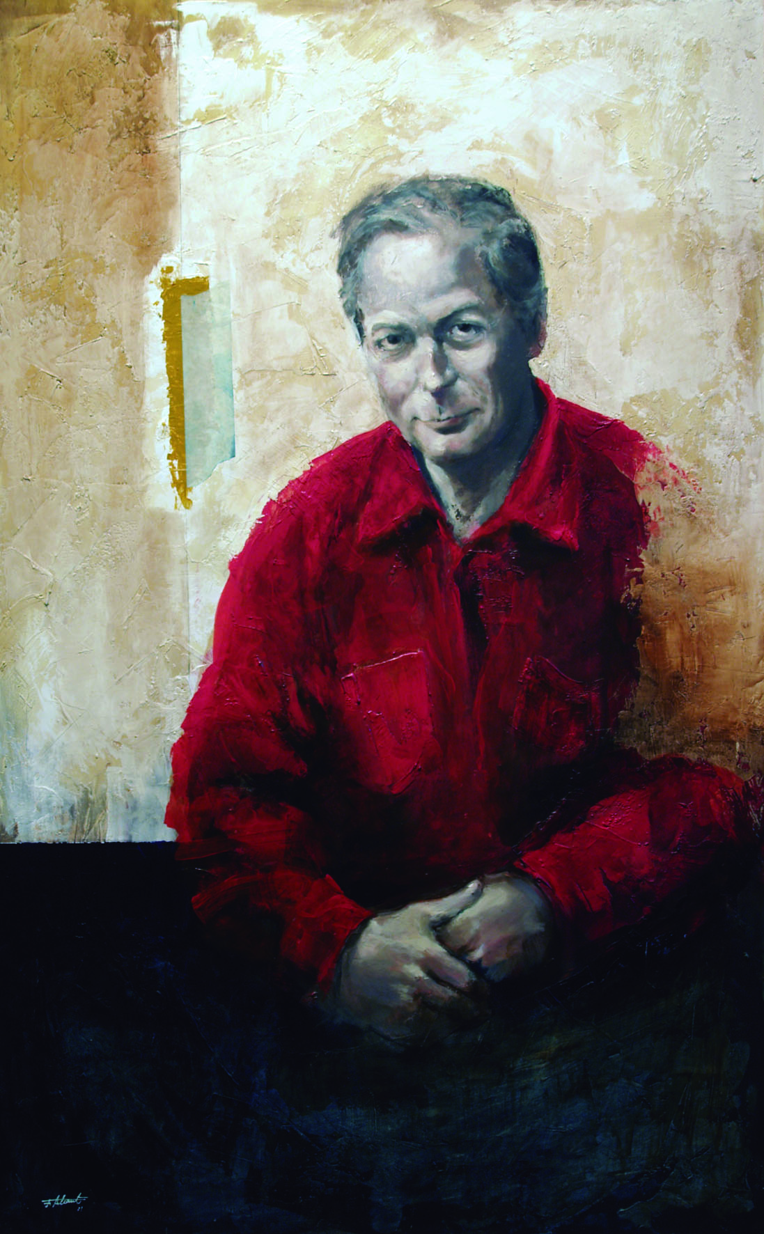 Retrato sedente de medio cuerpo del poeta Antonio Carvajal. La silueta del protagonista se recorta sobre un fondo neutro de tonalidades cálidas beiges y ocres, destacando así el recorte de la camisa roja y la cabeza en escala de grises. El tercio inferior del lienzo tiene el negro como protagonista, destacando las manos que, entrelazadas, se recrean en grises.