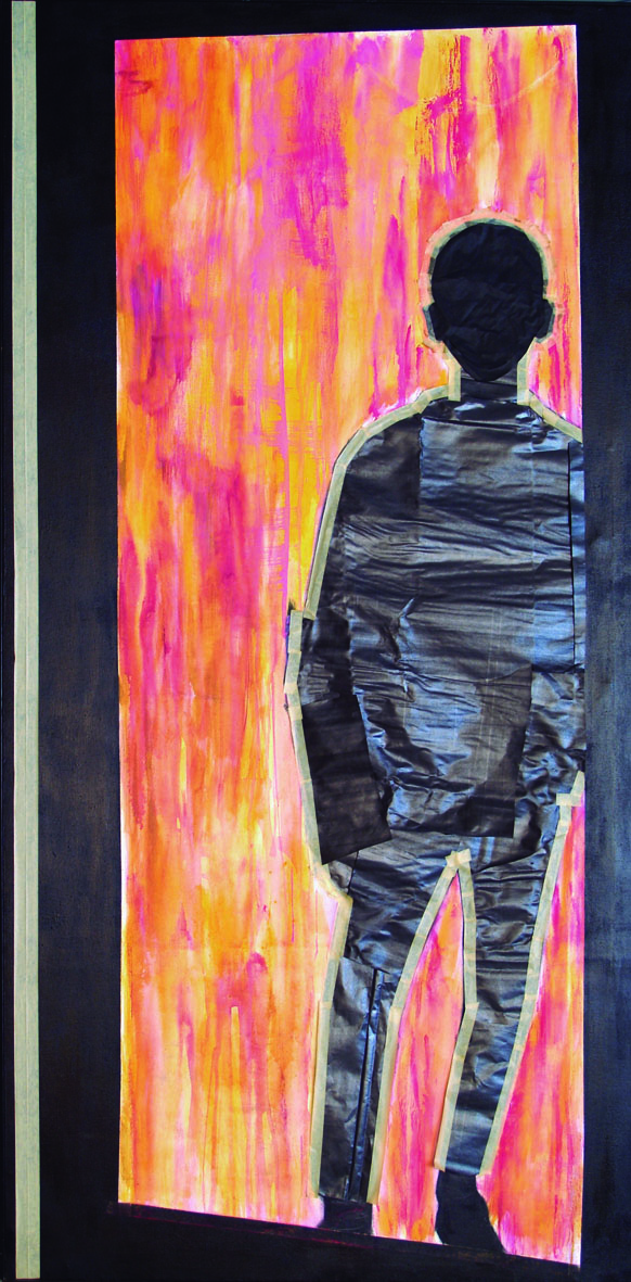 En un formato rectangular, el artista desarrolla una composición de una marcada verticalidad, potenciada por dos bandas laterales de un denso negro y una figura humana creada haciendo uso de papel del mismo color.
