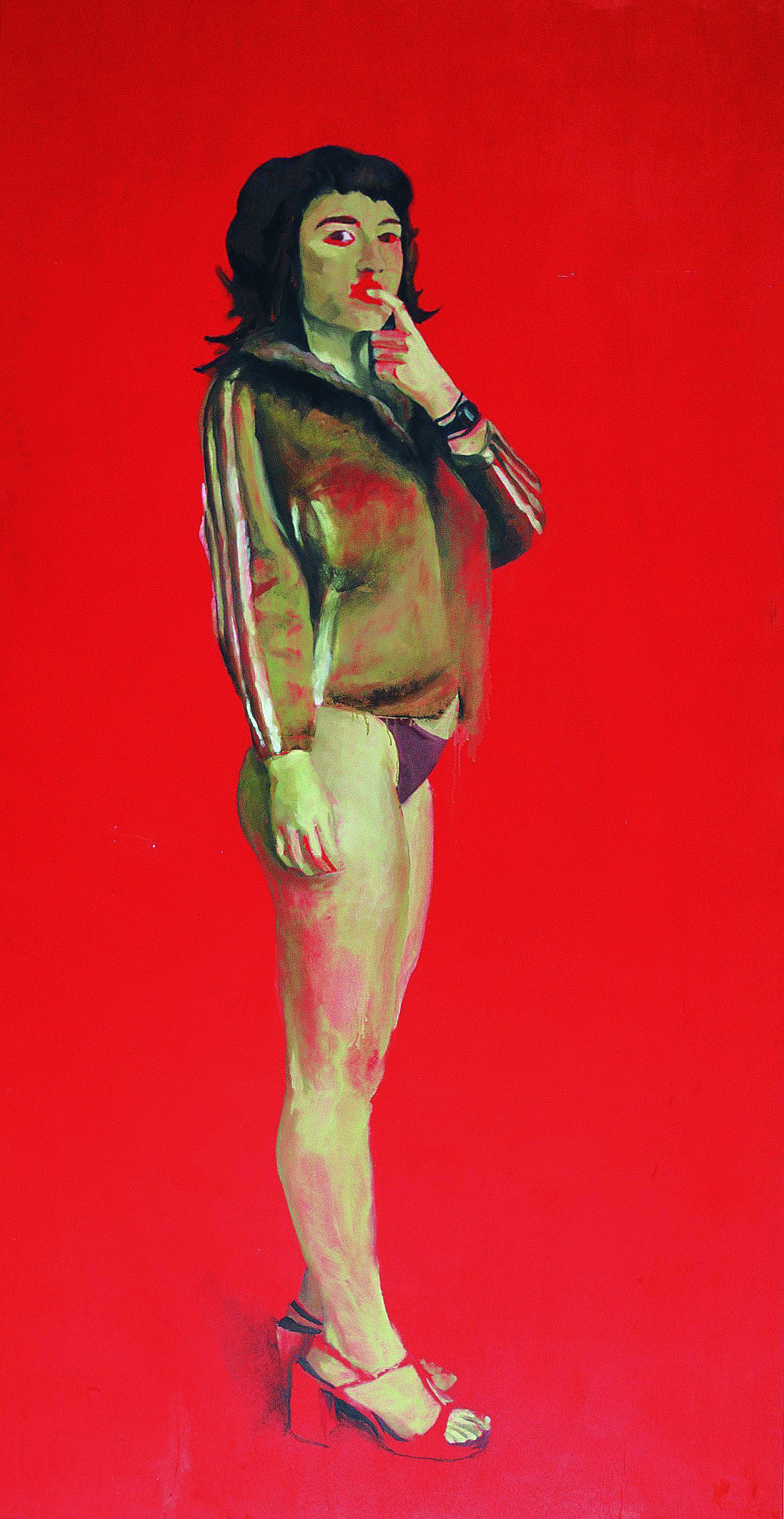 Retrato de una mujer joven, cuya silueta se recorta sobre un fondo rojo brillante. La figura femenina se presenta a medio vestir, de cuerpo entero y medio perfil. Viste sandalias rojas de tacón ancho, braga granate y la tradicional e icónica sudadera de la marca Adidas en tonos ocres y rojizos, cerrada en el centro con cremallera, y líneas blancas en el lateral del brazo.