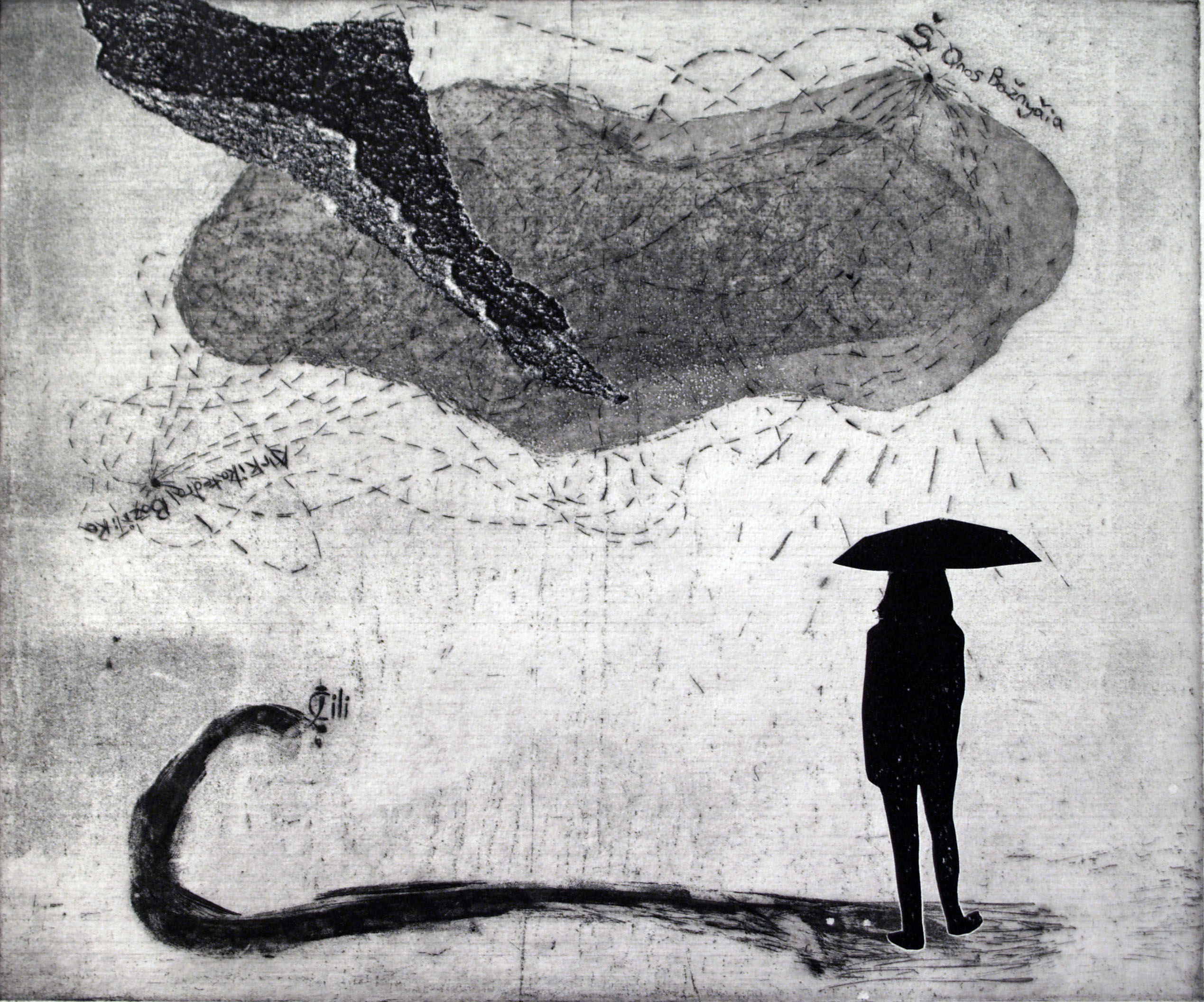 Una figura femenina se cubre con un paraguas. Su estilizada silueta permanece inmóvil ante un camino proyectado en profundidad sobre el papel, cubierto por una densa y amplia nube configurada en tintas medias que imprimen un tono gris del que irradian líneas verticales y horizontales, unas sugieren movimiento y las otras, lluvia.