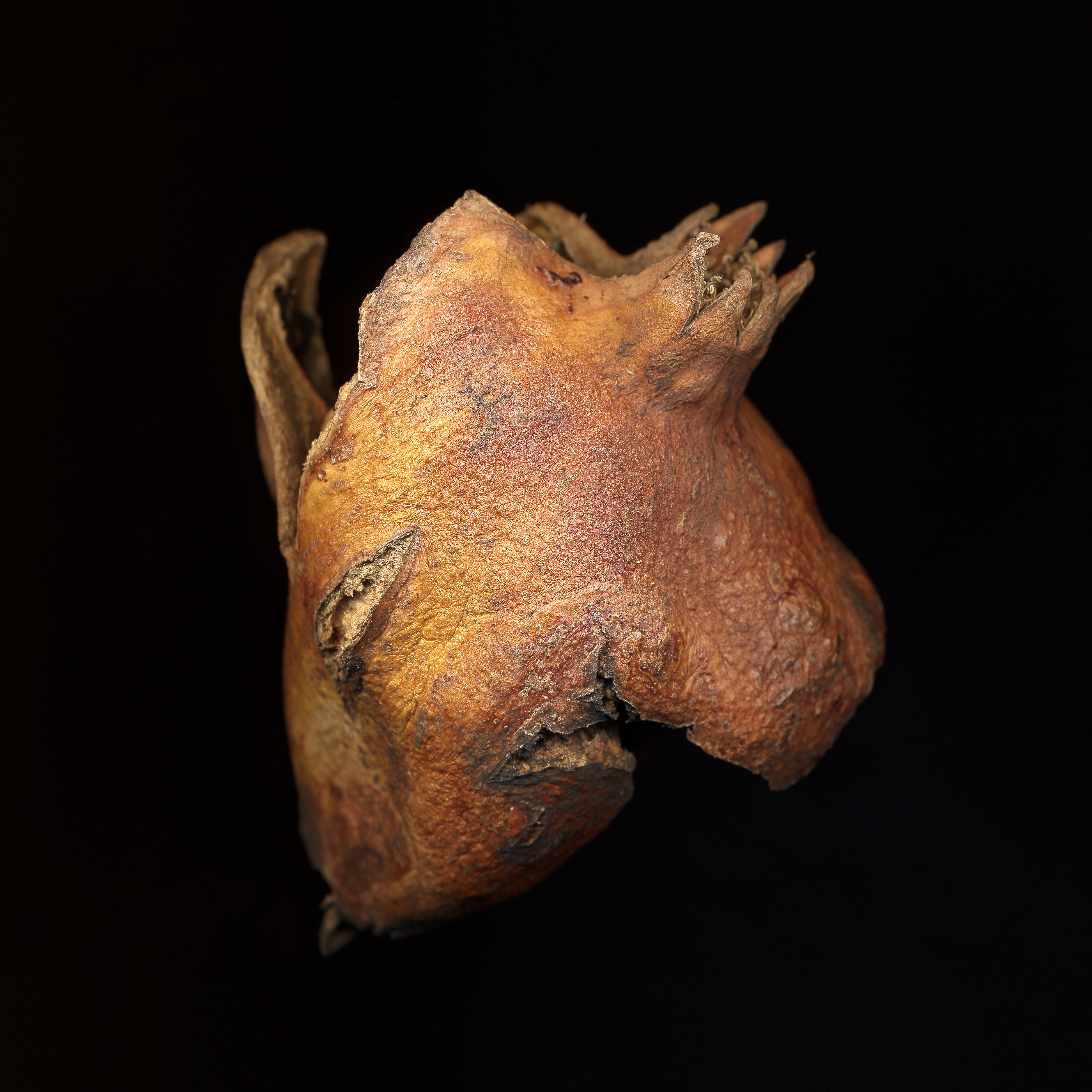 Fotografía de la piel seca de una granada, ya vacía de los granos del fruto. La imagen se toma en clave baja, es decir, potencia la presencia del objeto fotografiado mientras que el fondo permanece completamente negro. Forma parte de un tríptico en el que el mismo objeto se fotografía desde diferentes ángulos para mostrar diferentes puntos de vista.