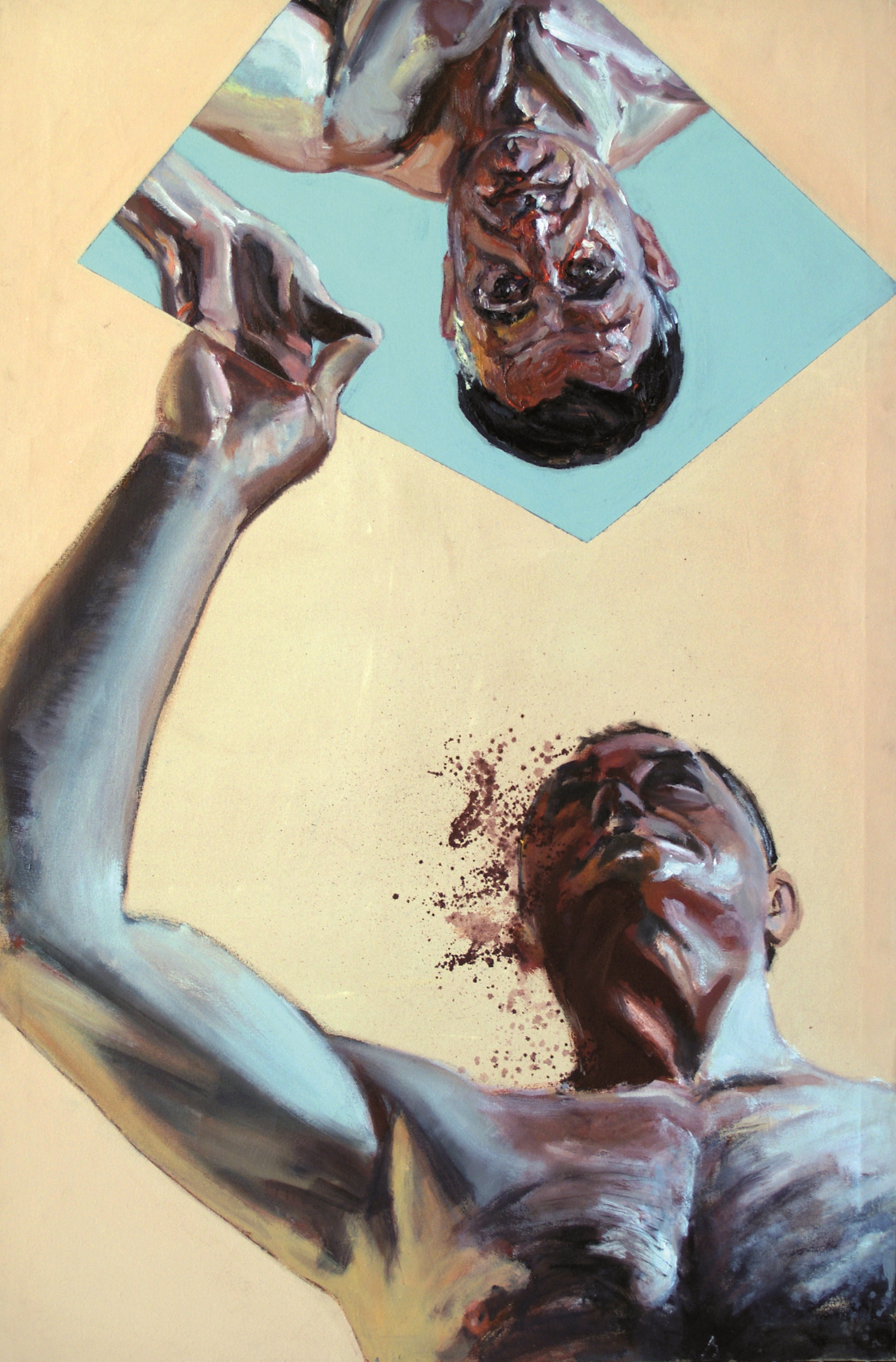 Retrato en contrapicado de una figura masculina, captada desde el pecho hasta la cabeza. El protagonista porta un espejo en el brazo izquierdo y lo alza, de manera que nos permite ver su rostro en el reflejo.