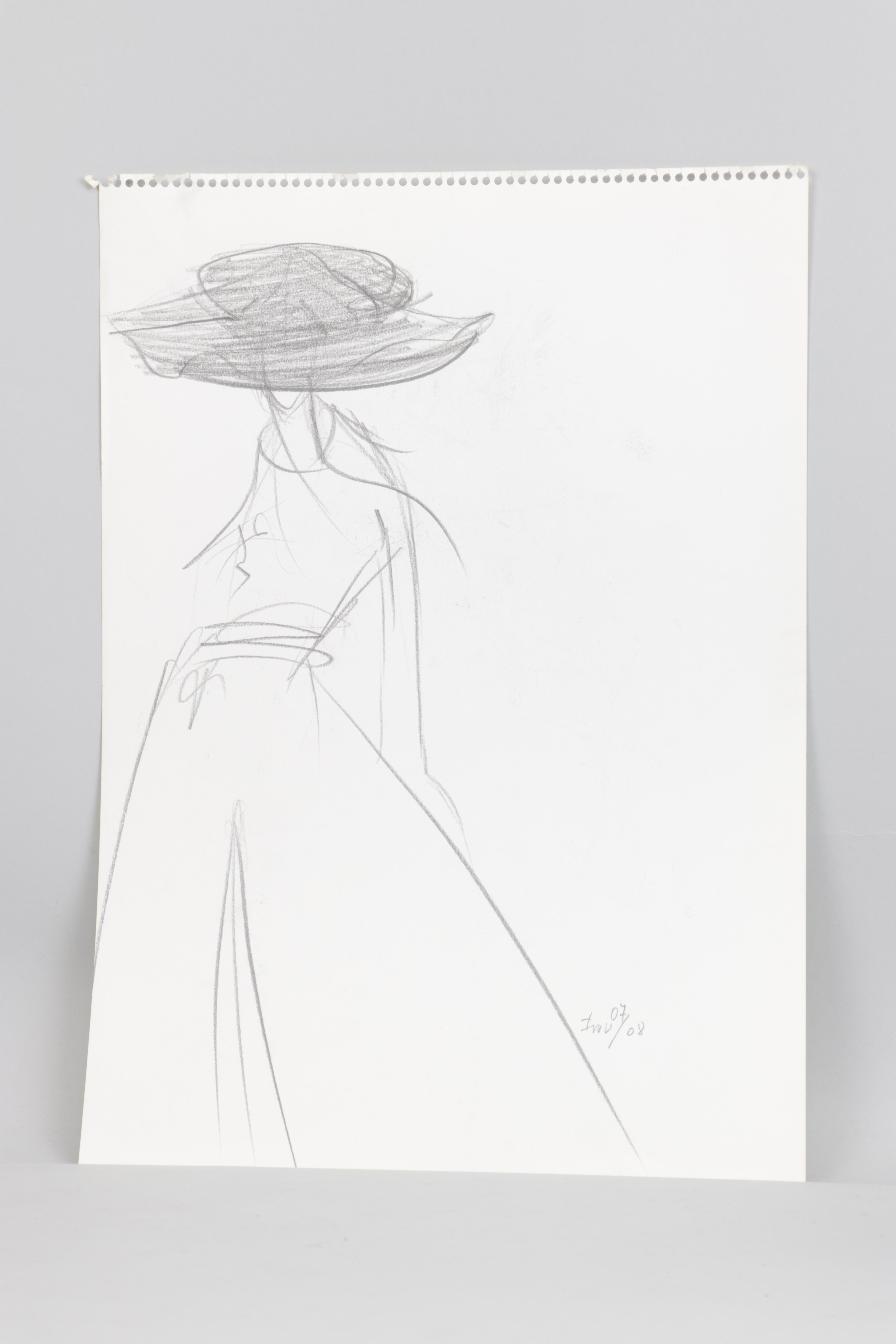 Boceto a lápiz sobre papel. Representa un figurín de moda con vestido ceñido a la cintura y falda de capa, cerrando el conjunto con un sombrero de ala.