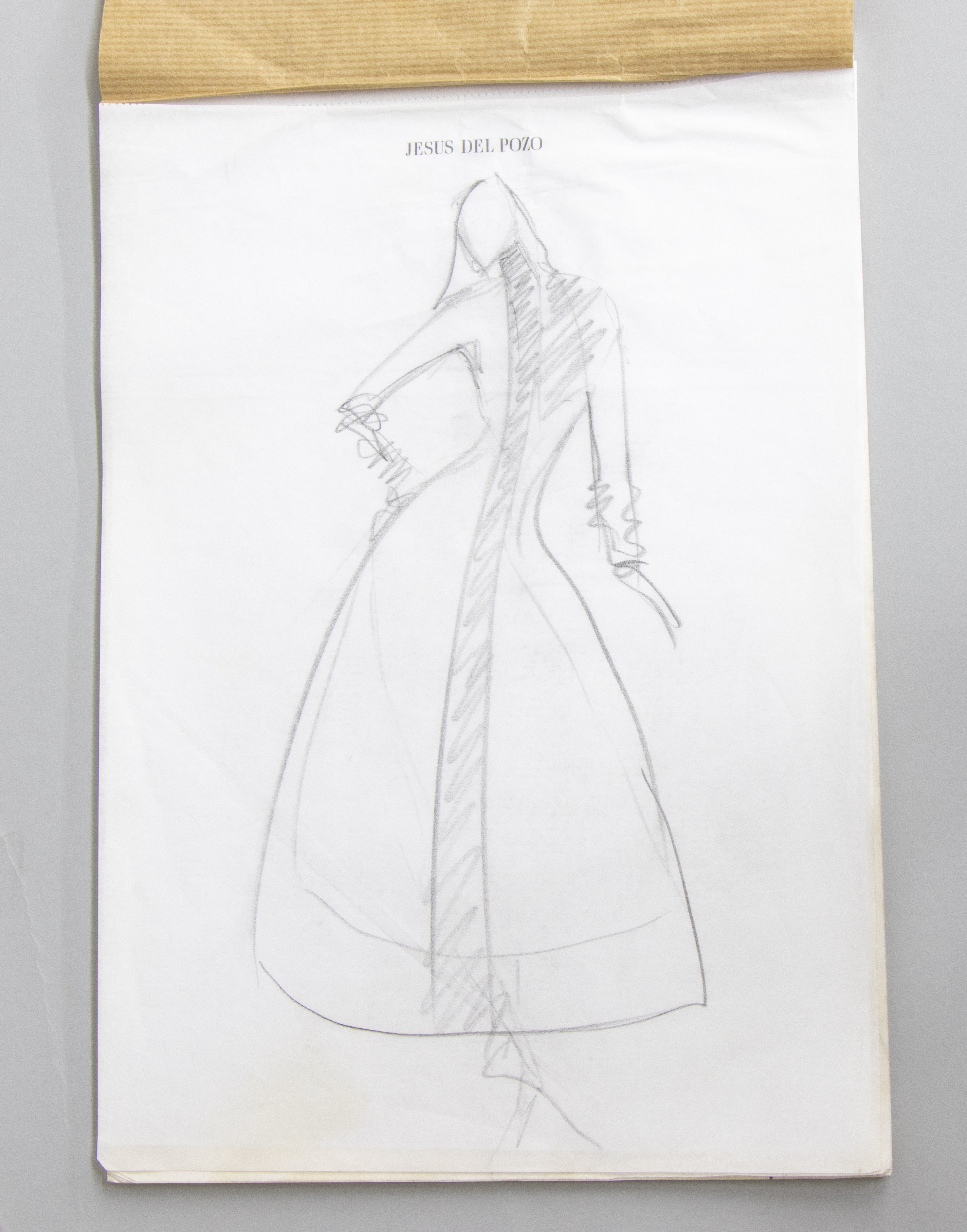 Boceto de moda realizado en grafito sobre papel. Reproduce un esbozo de figura femenina vestida con una prenda de cuerpo completo, manga larga y cuello a la caja, con un amplio volumen que parte de la cintura en la mitad inferior.
