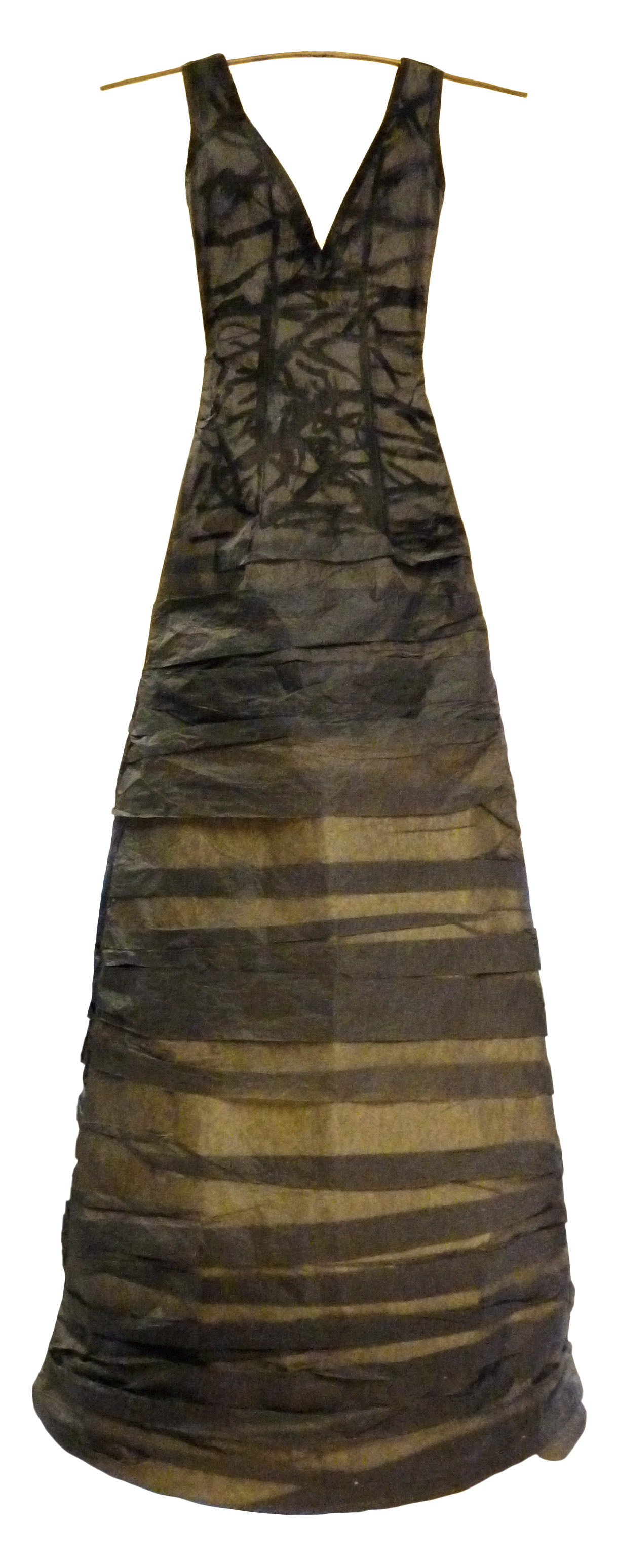 Vestido escultura creado a partir de cartón y papel para generar dos capas de materia donde la interior sujeta la exterior y, además de dar apresto y generar volumen, produce un contraste cromático que simula la combinación de textiles como seda y tul, en un juego de transparencias y texturas.