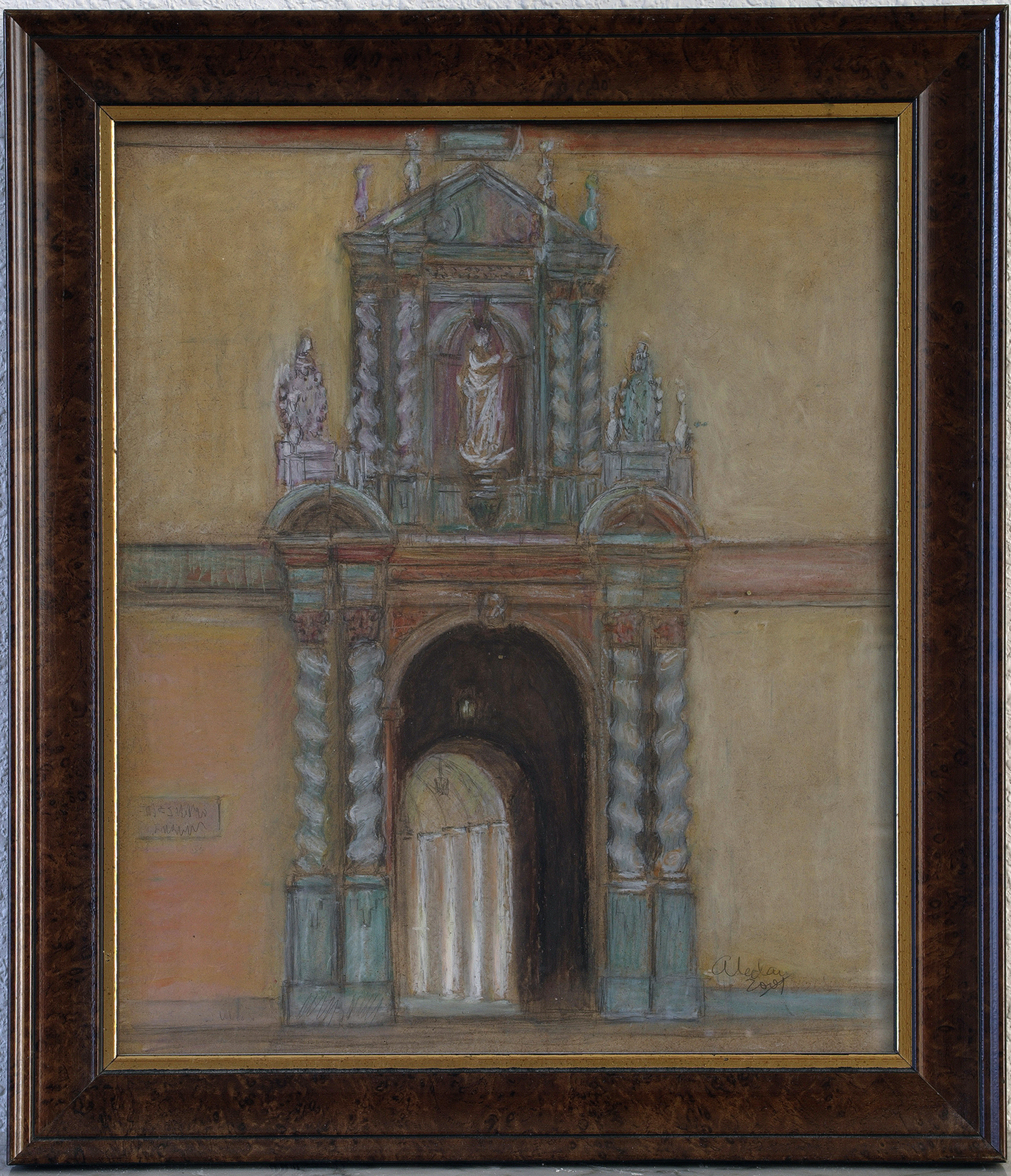 Enmarca la portada sin dar cabida al escudo que remata el conjunto rompiendo la cornisa superior del edificio, mientras que recoge con detalle las columnas salomónicas como los elementos decorativos más llamativos. El dibujo de los frontones partidos es impreciso y poco certero, mientras que el contraste lumínico entre los espacios abiertos, configurados por la fachada y el patio, y el zaguán, es uno de los valores más interesantes de la pieza.
