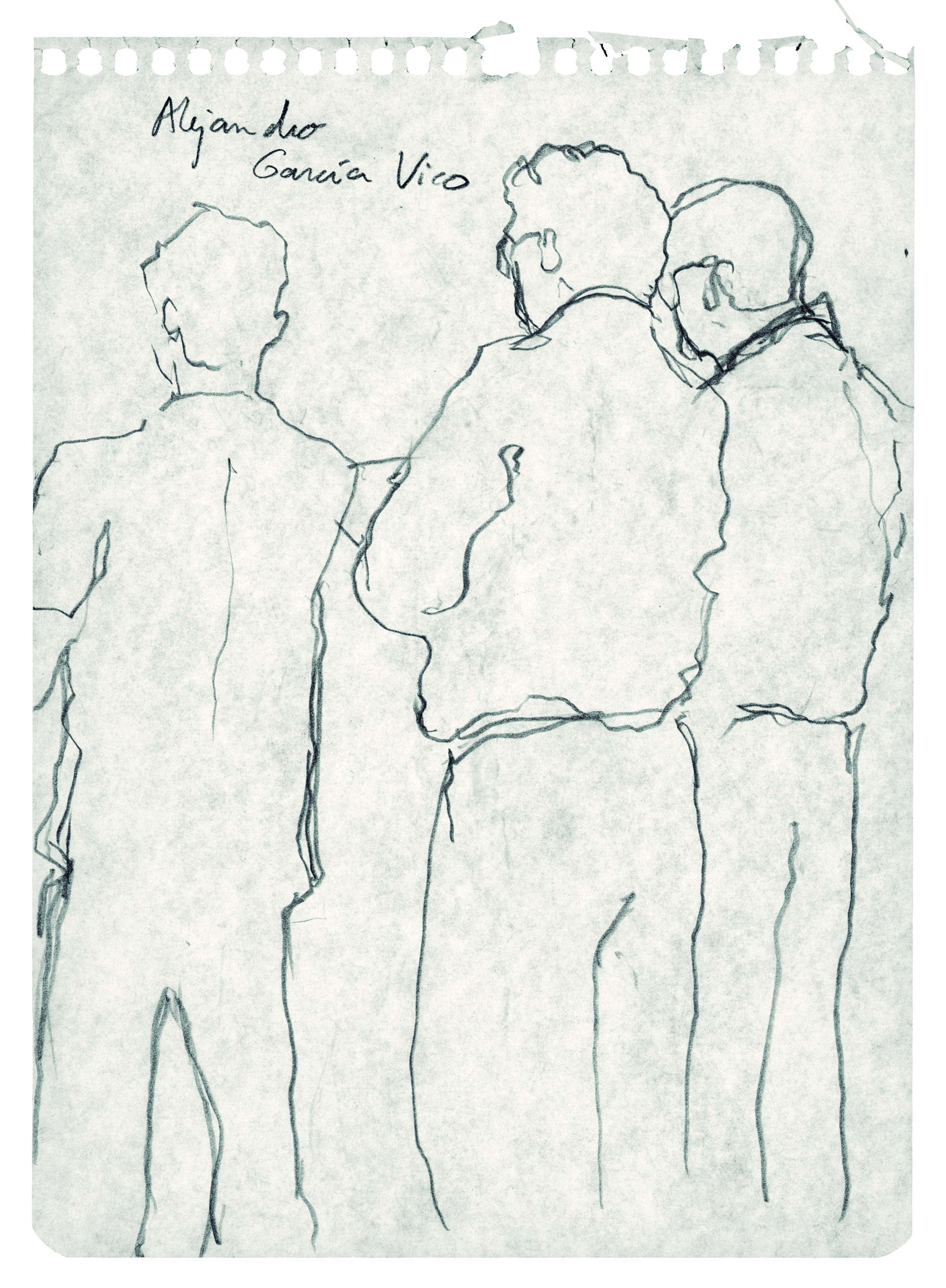 Dibujo realizado con motivo del Festival de Música y Danza del año 2006, perteneciente a una serie de 32 dibujos, todos ellos realizados con la técnica de grafito sobre un fondo de papel blanco, destacando la figura a base de sinuosas líneas complementándose en algunos casos de ciertos toques de color. El dibujo muestra tres figuras masculinas de espalda, como si se tratara de un grupo de espectadores asistiendo a algunas de las actuaciones del Festival de Música y Danza.