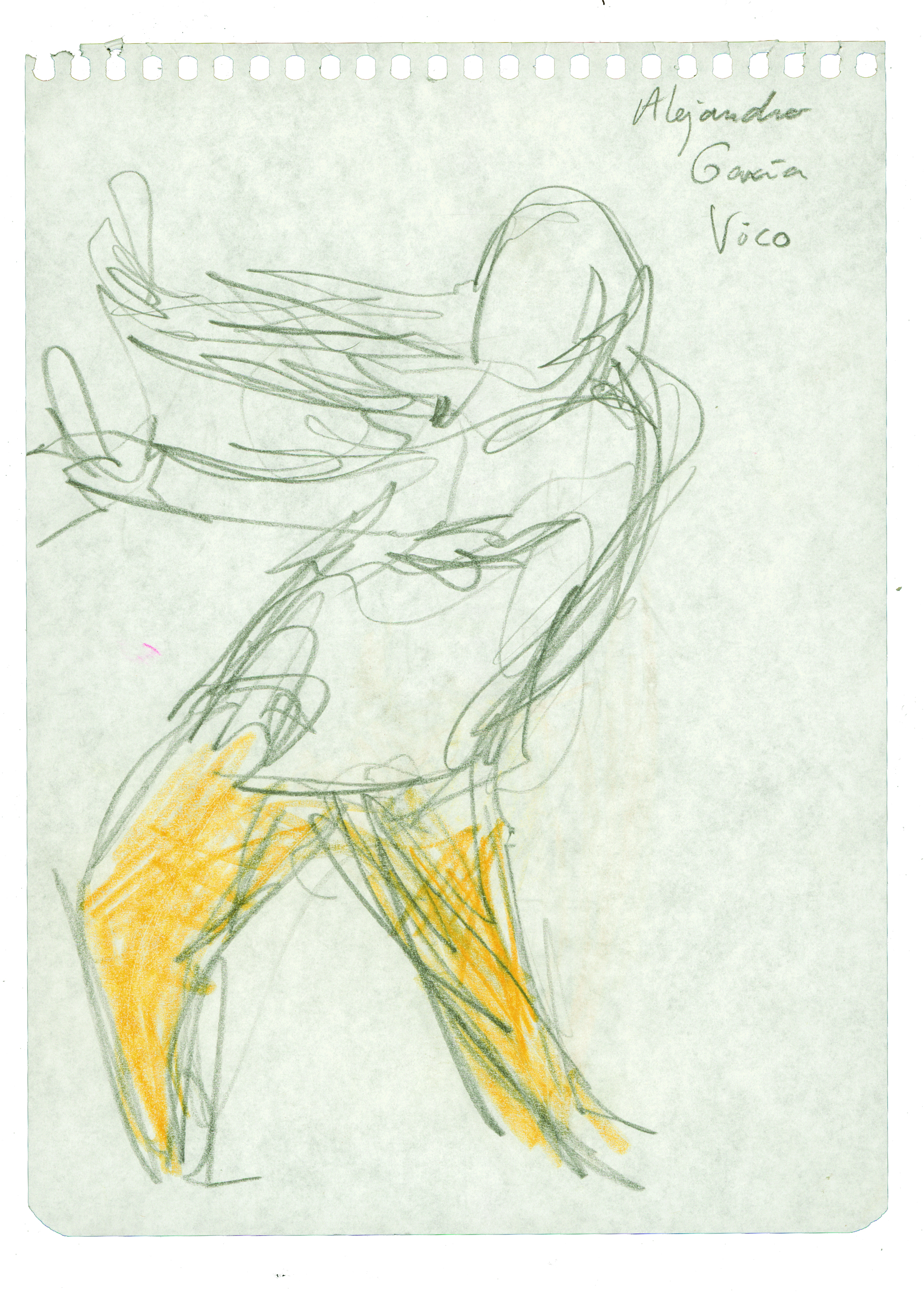 Realizado a grafito y lápices de colores, representa a un personaje en posición frontal y actitud danzante. Mientras que la mitad superior del cuerpo está abocetada utilizando únicamente las líneas de contorno a lápiz, la mitad inferior está coloreada en amarillo.