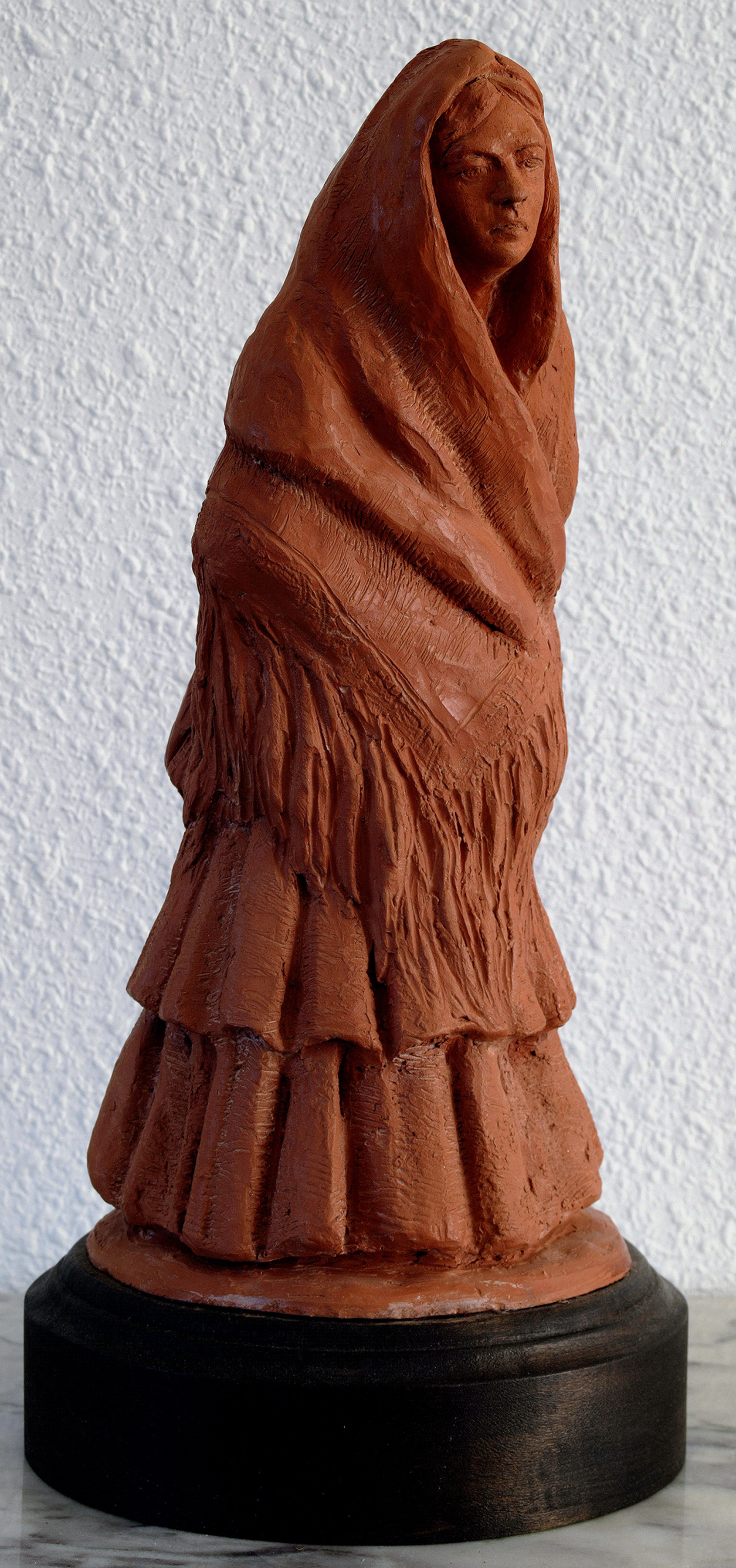 Pequeña escultura de barro que representa a una mujer joven con vestido de volantes envuelta en un mantón con flecos que cubre su cabeza. Su tronco está ligeramente inclinado hacia delante, la cabeza un poco ladeada y la mirada frontal. Sus brazos se intuyen cruzados en el abdomen, cerrando el mantón sobre el torso, generando una composición tradicional marcada por la posición de la figura humana y sus vestiduras.