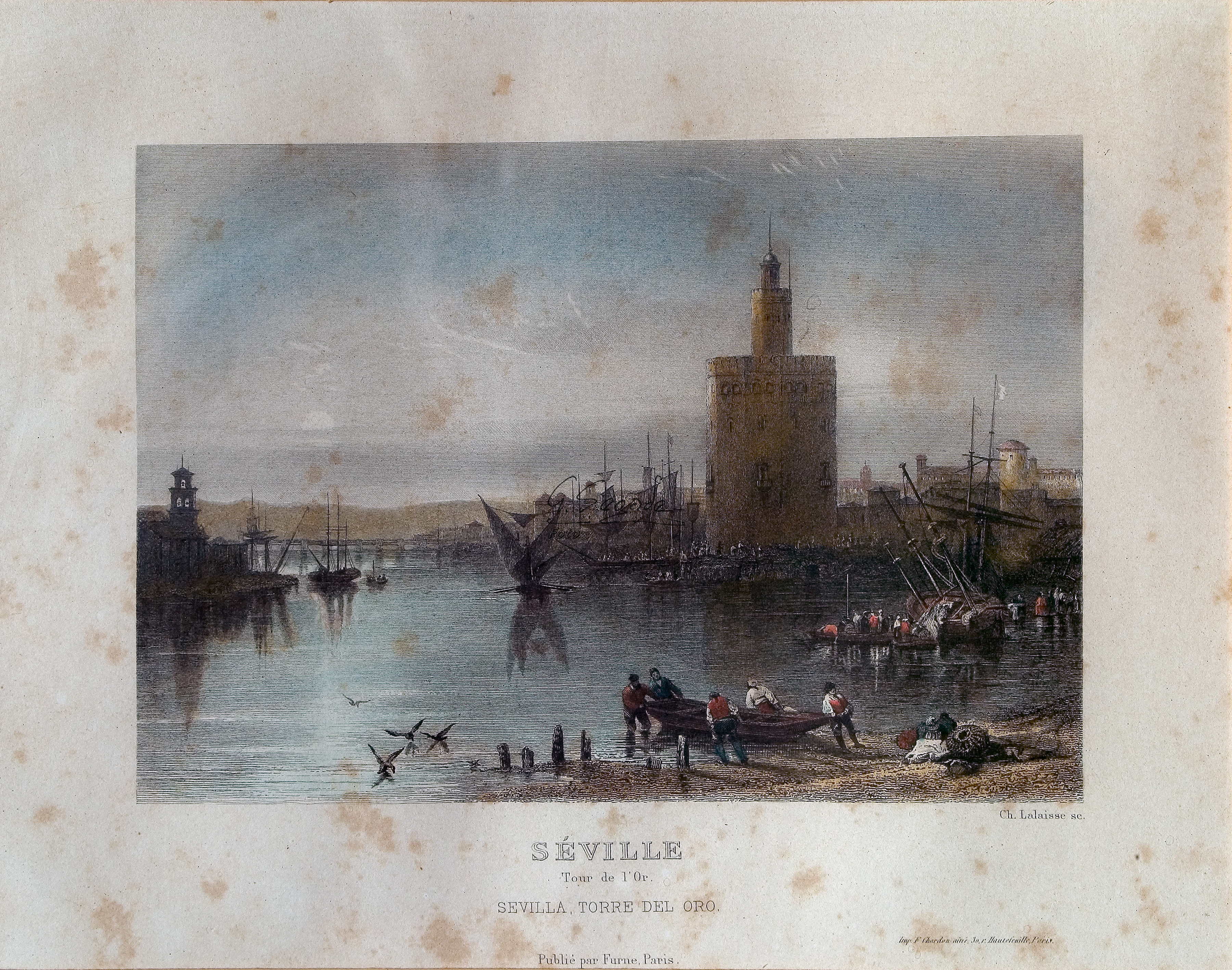 Ángulo inferior derecho "Ch. Lalaisse sc." / Centro de la imagen: "SÉVILLE / Tour de l'Or / Sevilla, Torre del Oro / Publié par Furne, Paris" / Ángulo inferior derecho "Imp F Chardon ainé, 3n. r. Hautefeuille, Paris"