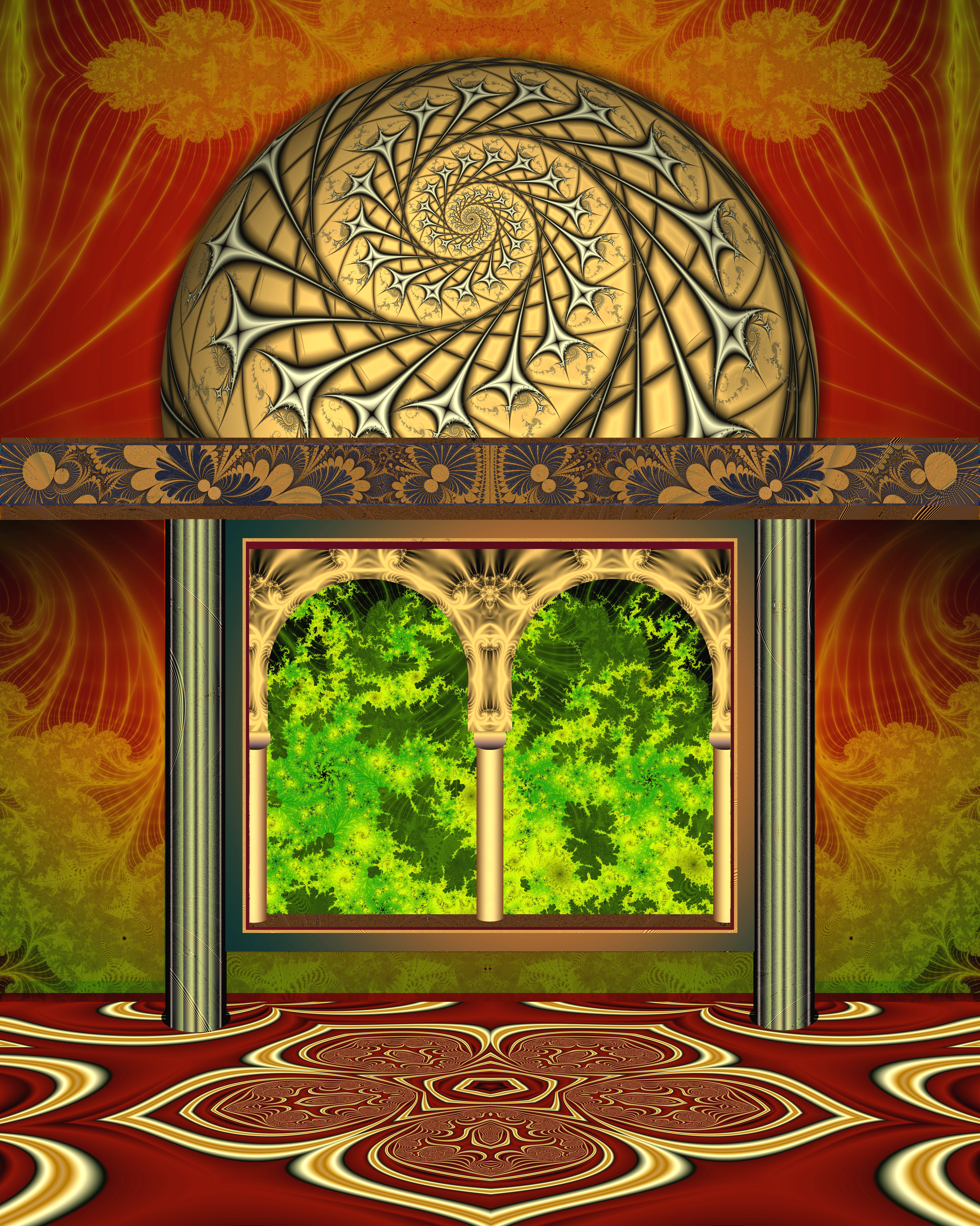 Composición que nos recuerda el interior de una habitación decorada con formas vegetales amarillas sobre un fondo rojo tanto las paredes como el suelo. La pared se encuentra centrada por una ventana de doble arco enmarcada por dos fustes de columna estriados, un dintel con decoración ocre y marrón también con formas vegetales y sobre él una forma semiesférica que nos recuerda una cúpula decorada con una espiral. A través de la ventana podemos ver formas vegetales en un brillante y luminosos verde sobre fondo negro.