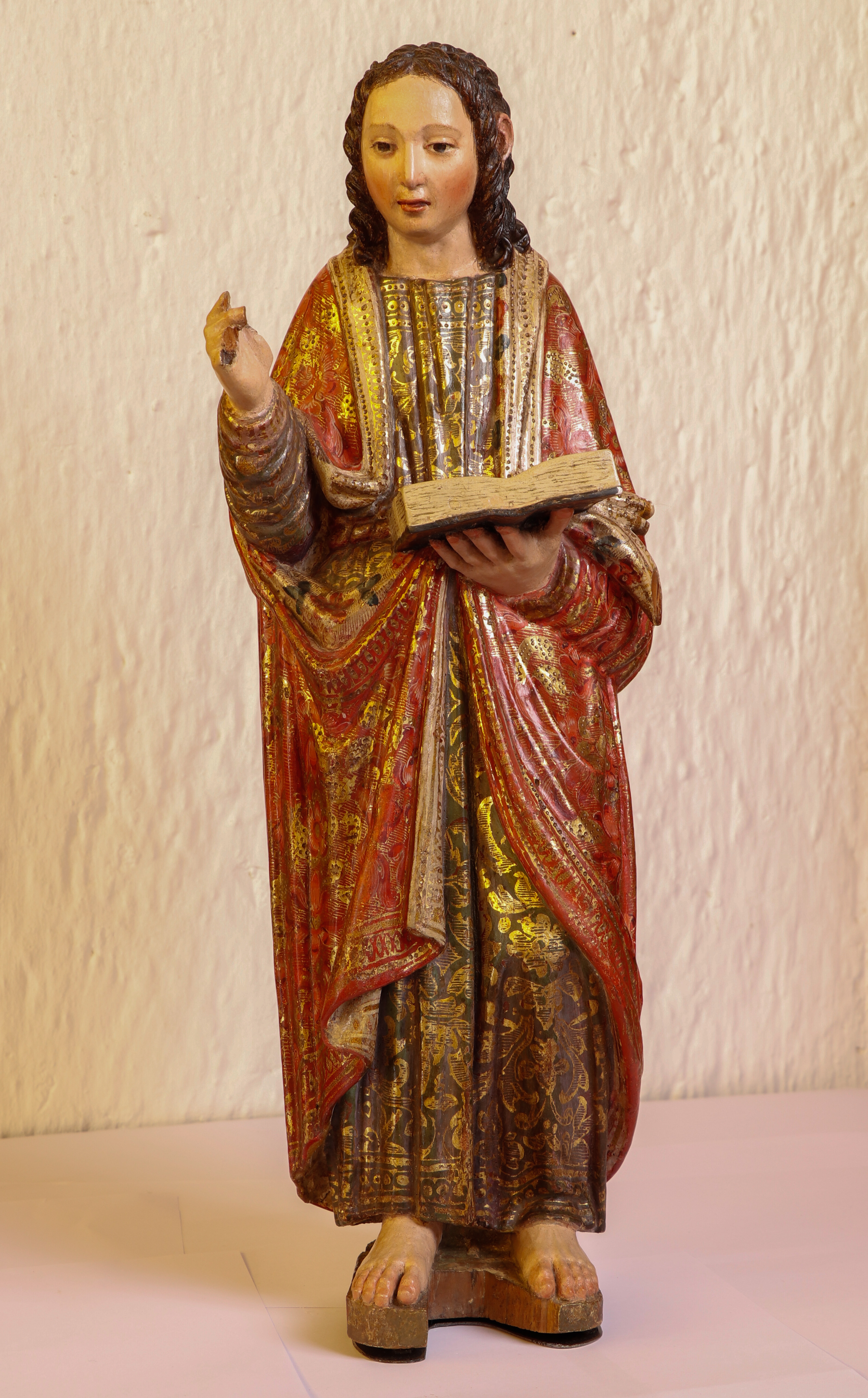 Esta pequeña escultura se ubica en la hornacina derecha del Sagrario del Retablo de los Santos Juanes. Iconográficamente, se representa como escritor, con el evangelio abierto en la mano izquierda y la pluma en la derecha actualmente perdida. De juvenil aspecto, la figura muestra un rostro ovalado enmarcado por amplios rizos cuya estructura recuerda las esculturas de Pablo de Rojas. El artista intenta romper el estatismo haciendo avanzar la pierna izquierda, mientras la derecha recibe el peso del cuerpo. Viste túnica gris-pardo y manto rojo ricamente estofados con motivos vegetales y geométricos. La espalda es recta y lisa, carente de talla y policromía, deja en esta zona la madera vista. Sus características estilísticas, al igual que las de San Juan Bautista, con la que forma pareja, permiten encuadrarlos en el tercer cuarto del Quinientos granadino, entre los discípulos de Siloé y los albores de Pablo de Rojas.