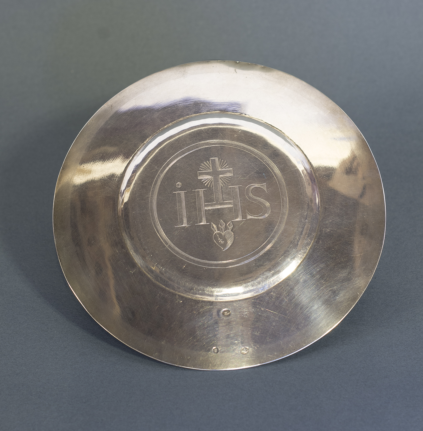 Patena de anverso dorado mate liso y reverso plateado, decorado con el anagrama "IHS" sobre el que hay una cruz, y debajo de él, un corazón.