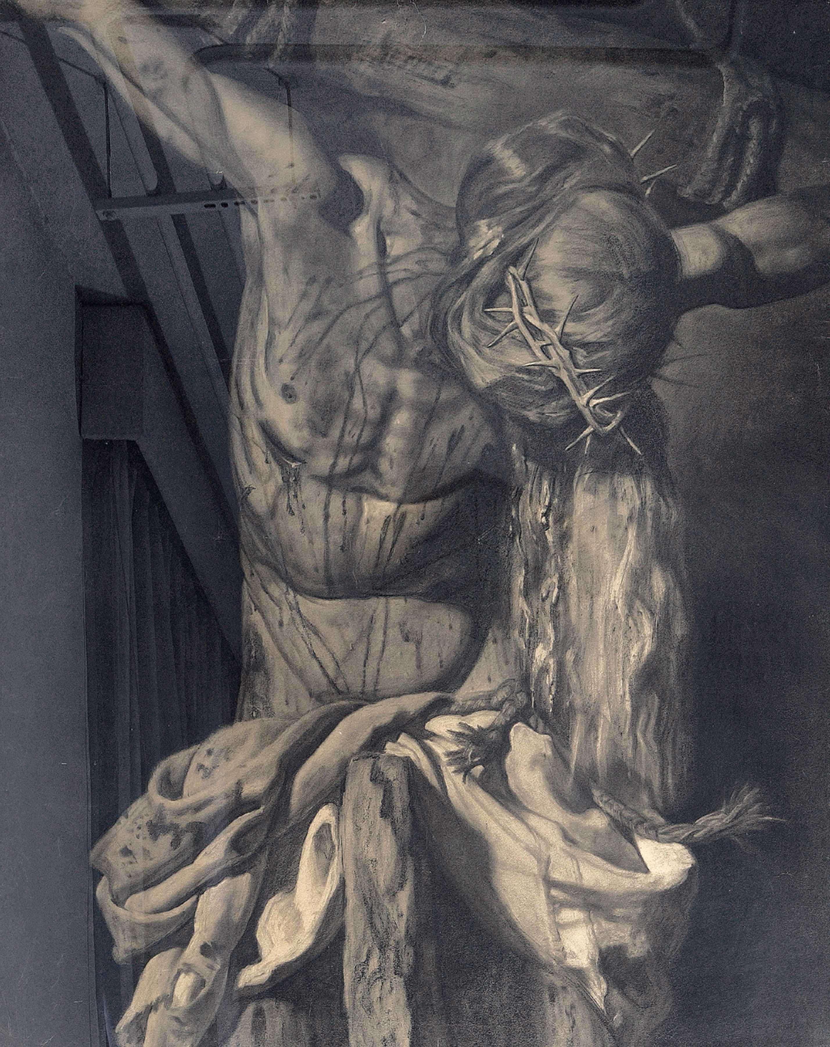 Estudio preparatorio para el Cristo en la Cruz realizado sobre papel caballo con carboncillo y lápiz compuesto (realizado con grafito o carboncillo mezclado con cera o arcilla) y pegado sobre táblex.