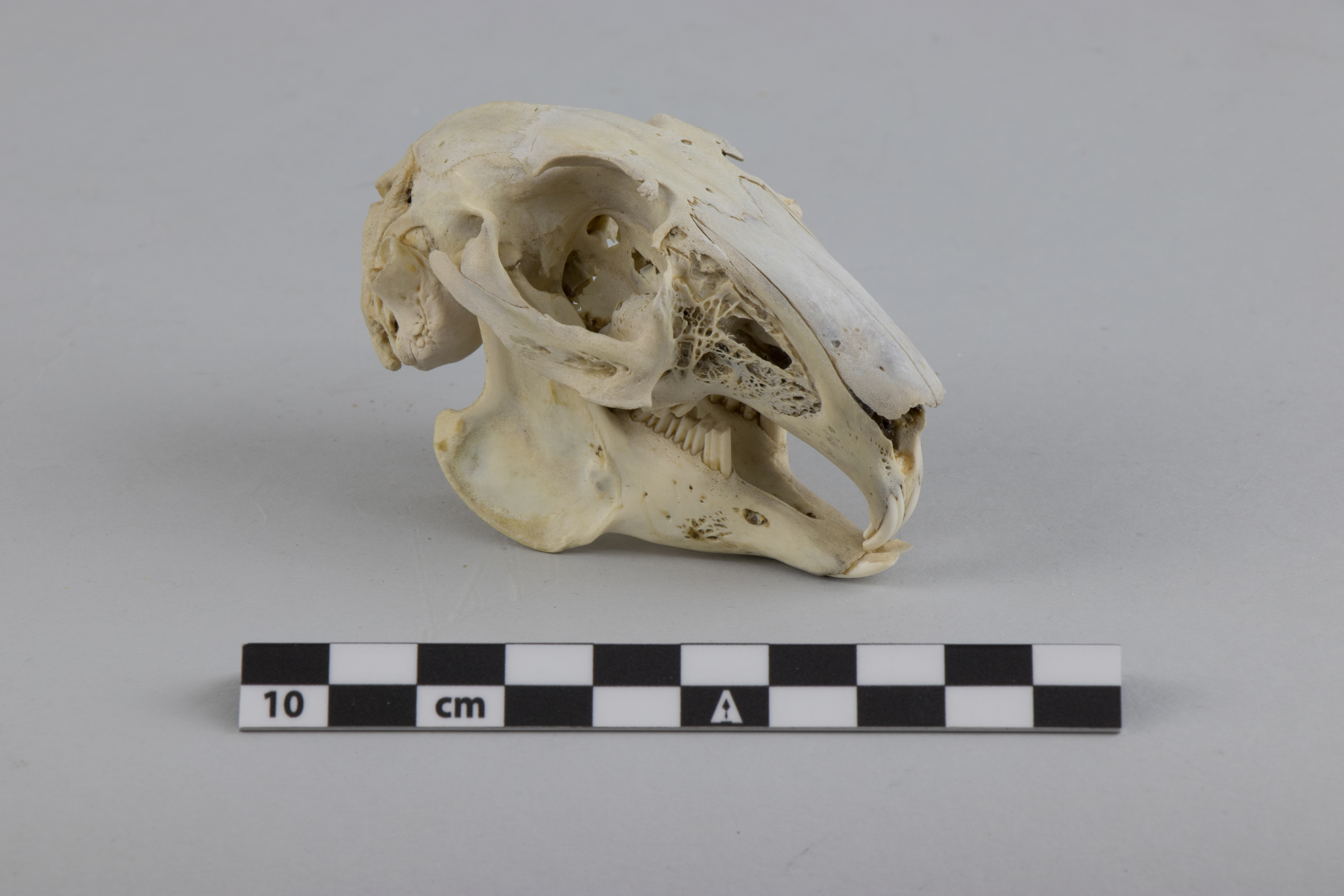 Cráneo con mandíbula completa de roedor, podría ser un conejo.