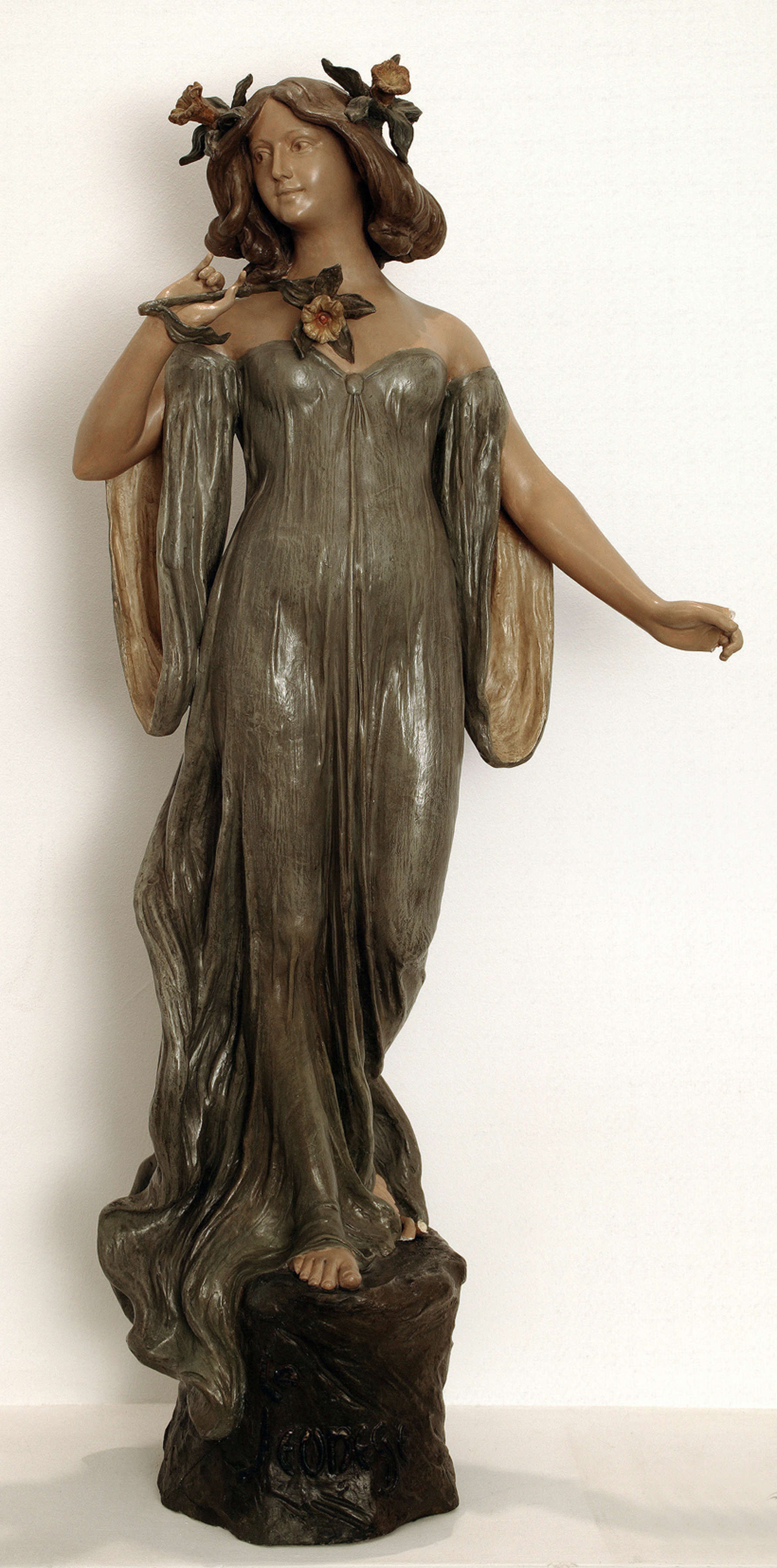Se trata de una reproducción en escayola fabricada en serie sobre un original modernista de Sydeu. El Art Nouveau está patente en toda la obra, siguiendo la juventud como uno de sus temas preferidos, figuración alegórica opuesta a la decrepitud, y en torno a la Primavera. En la obra aparecen los autores: "Sydeu", leyenda incisa en la parte superior del pedestal, y "Friedrich Goldscheider" en el dorso del mismo.