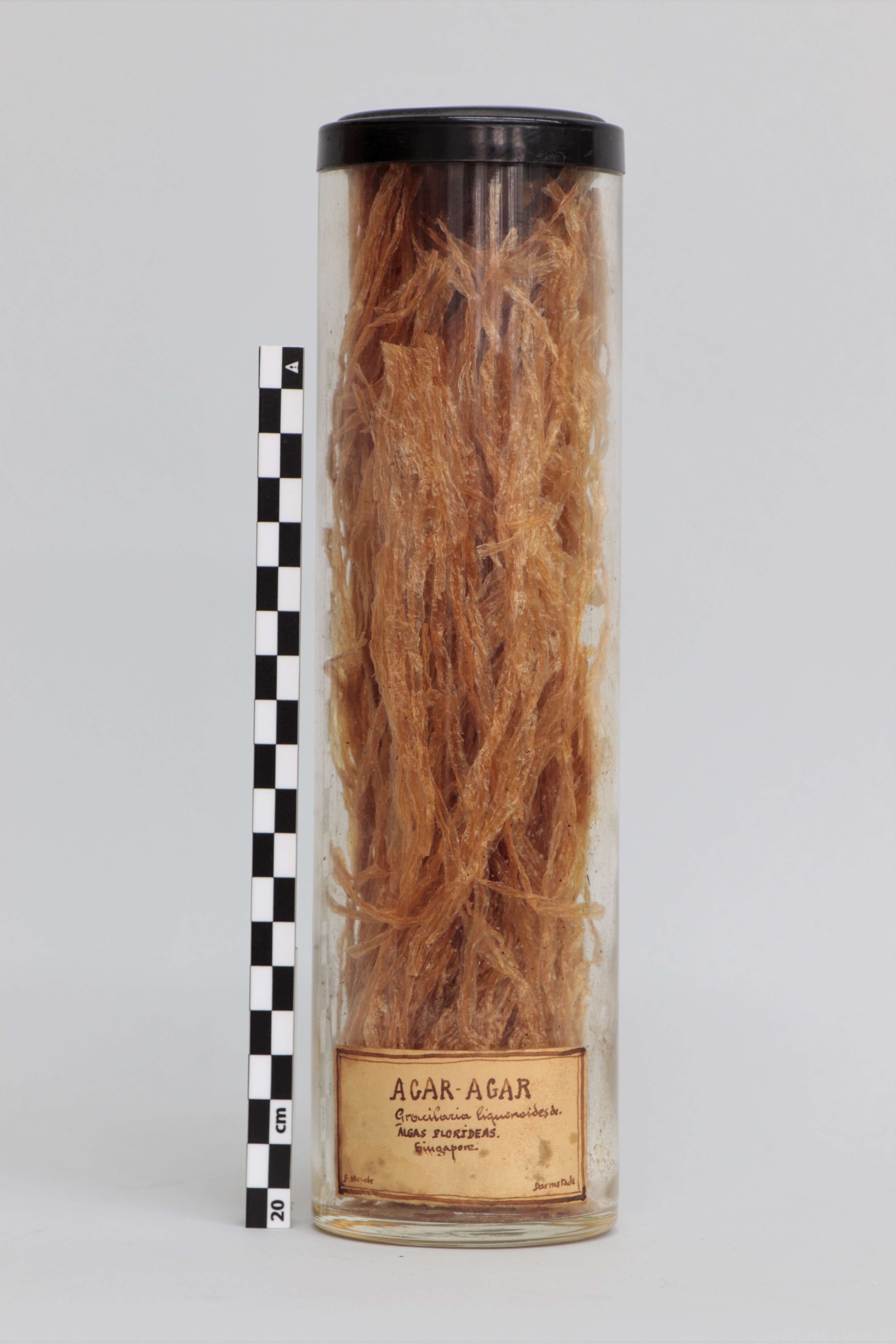 Bote de vidrio con forma cilíndrica que contiene algas del género Glacilaria, comúnmente llamadas Agar-agar (proveniente de singapur). En el exterior del bote lleva adherida una etiqueta de papel escrita a mano, donde se contempla el nombre de la sustancia contenida, su lugar de origen y la empresa que lo ha fabricado (E. Merck con sede en Darmstadt, Alemania). La tapa del bote es de un plástico rígido de color negro.