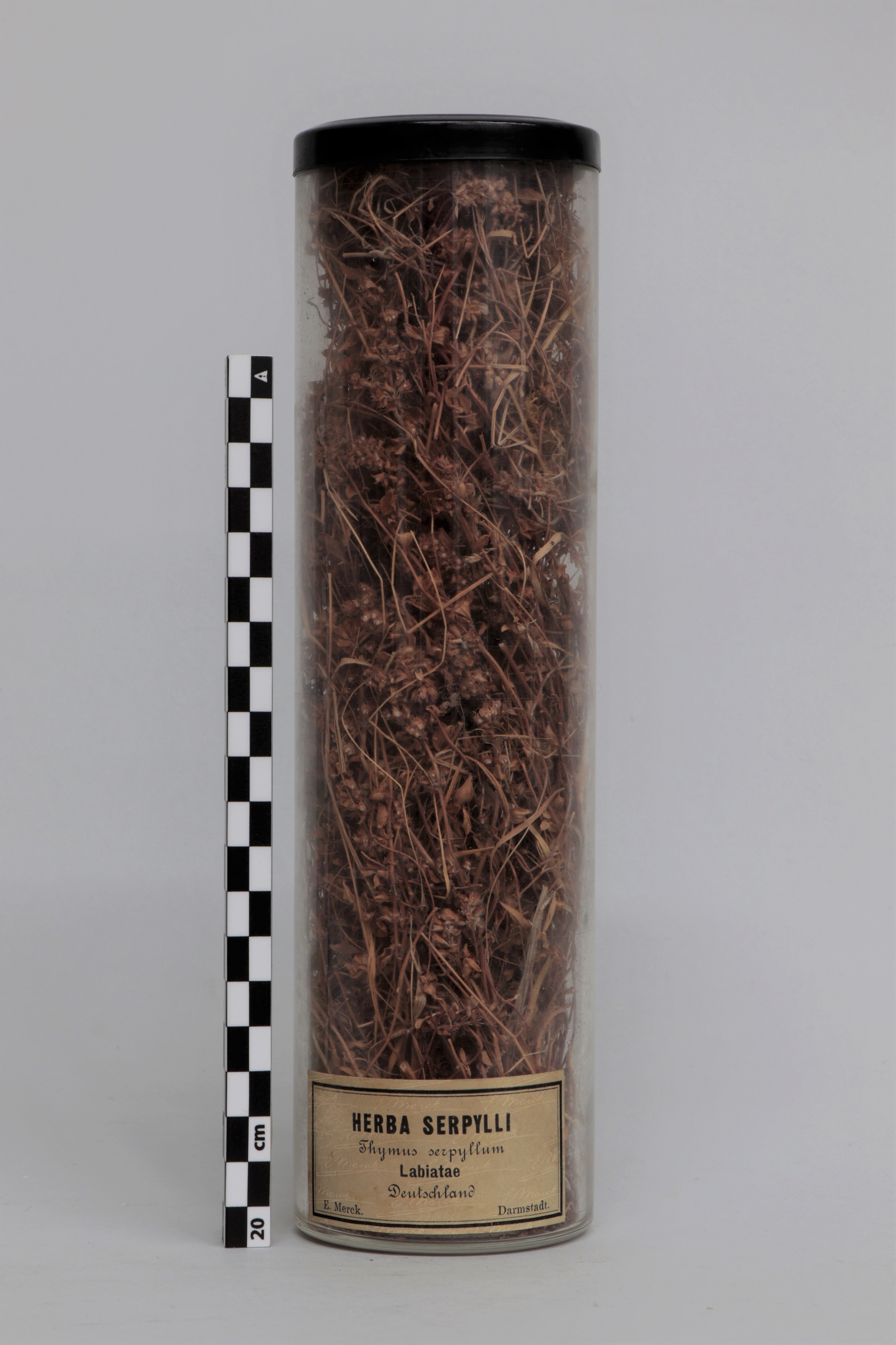 Bote de vidrio cilíndrico que contiene hojas de Thymus serpyllum, conocido como tomillo. En el exterior del bote lleva adherida una etiqueta rectangular de papel escrita a máquina, donde se contempla el nombre de la sustancia contenida, su lugar de origen y la empresa que lo ha fabricado (E. Merck con sede en Darmstadt, Alemania). La tapa del bote es de un plástico rígido de color negro.