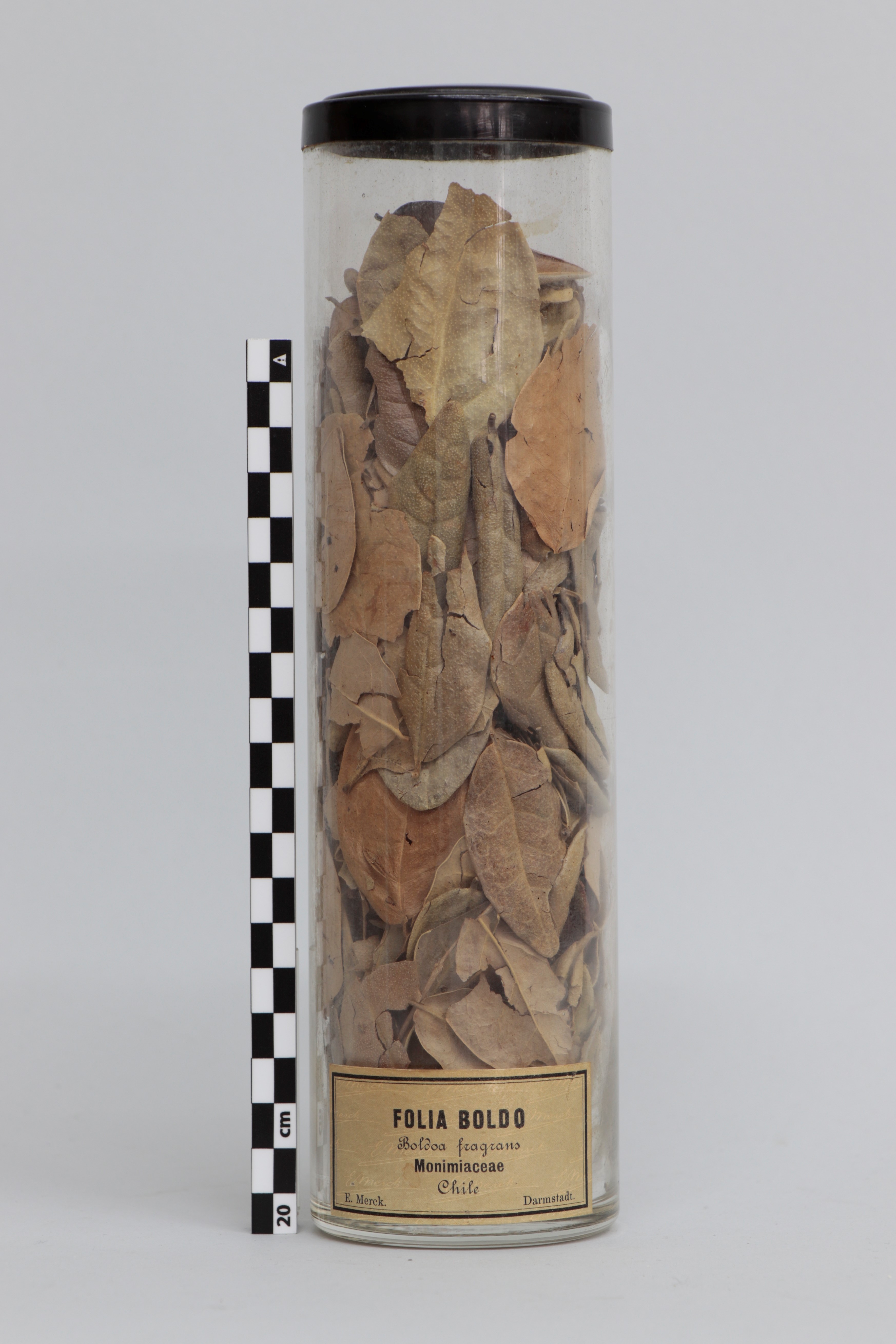 Bote de vidrio cilíndrico que contiene hojas de Peumus boldus, comúnmente conocido como boldo. En el exterior del bote lleva adherida una etiqueta rectangular de papel escrita a máquina, donde se contempla el nombre de la sustancia contenida, su lugar de origen y la empresa que lo ha fabricado (E. Merck con sede en Darmstadt, Alemania). La tapa del bote es de un plástico rígido de color negro.