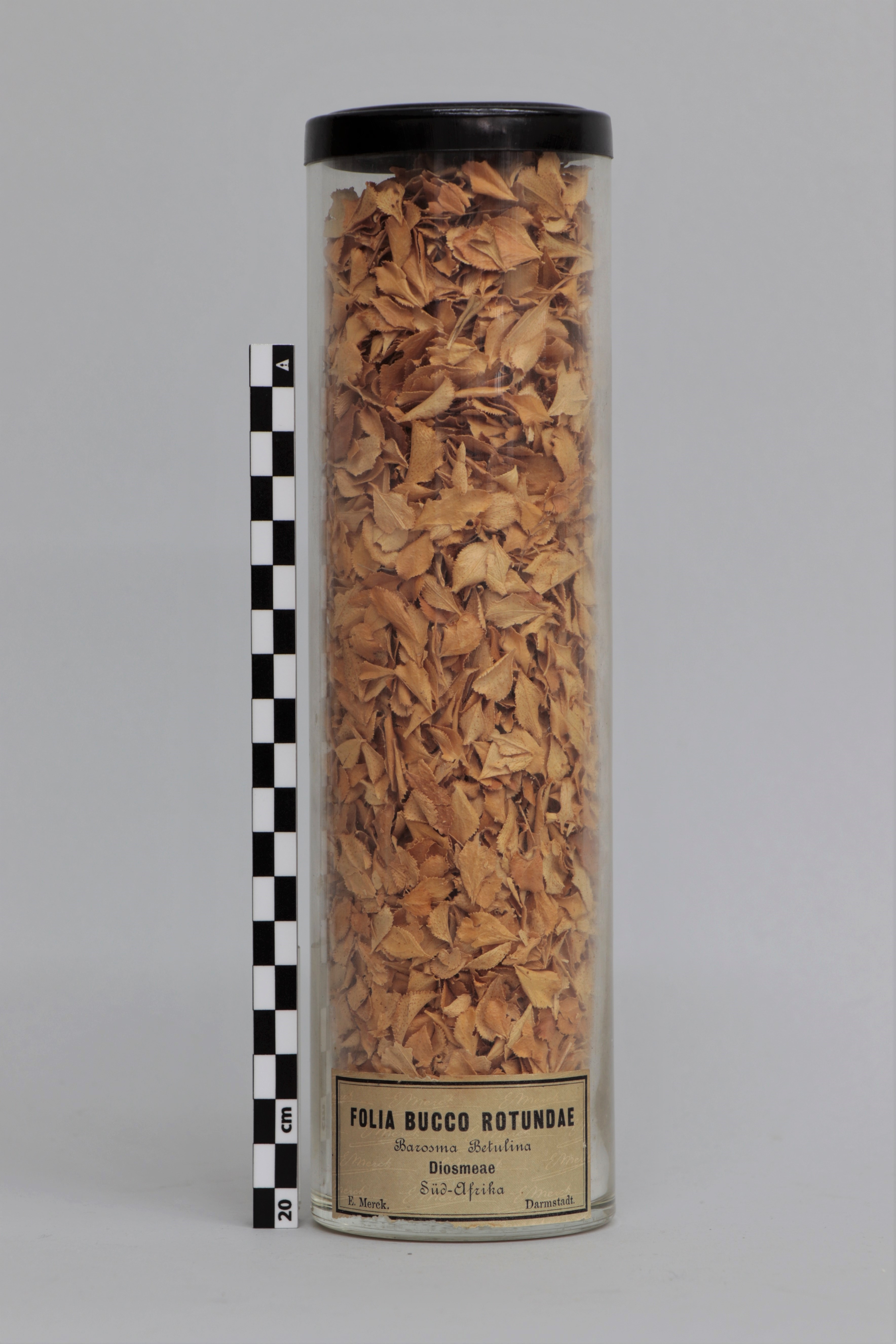 Bote de vidrio cilíndrico que contiene hojas de Agathosma betulina (planta procedente de Sudáfrica). En el exterior del bote lleva adherida una etiqueta rectangular de papel escrita a máquina, donde se contempla el nombre de la sustancia contenida, su lugar de origen y la empresa que lo ha fabricado (E. Merck con sede en Darmstadt, Alemania). La tapa del bote es de un plástico rígido de color negro.