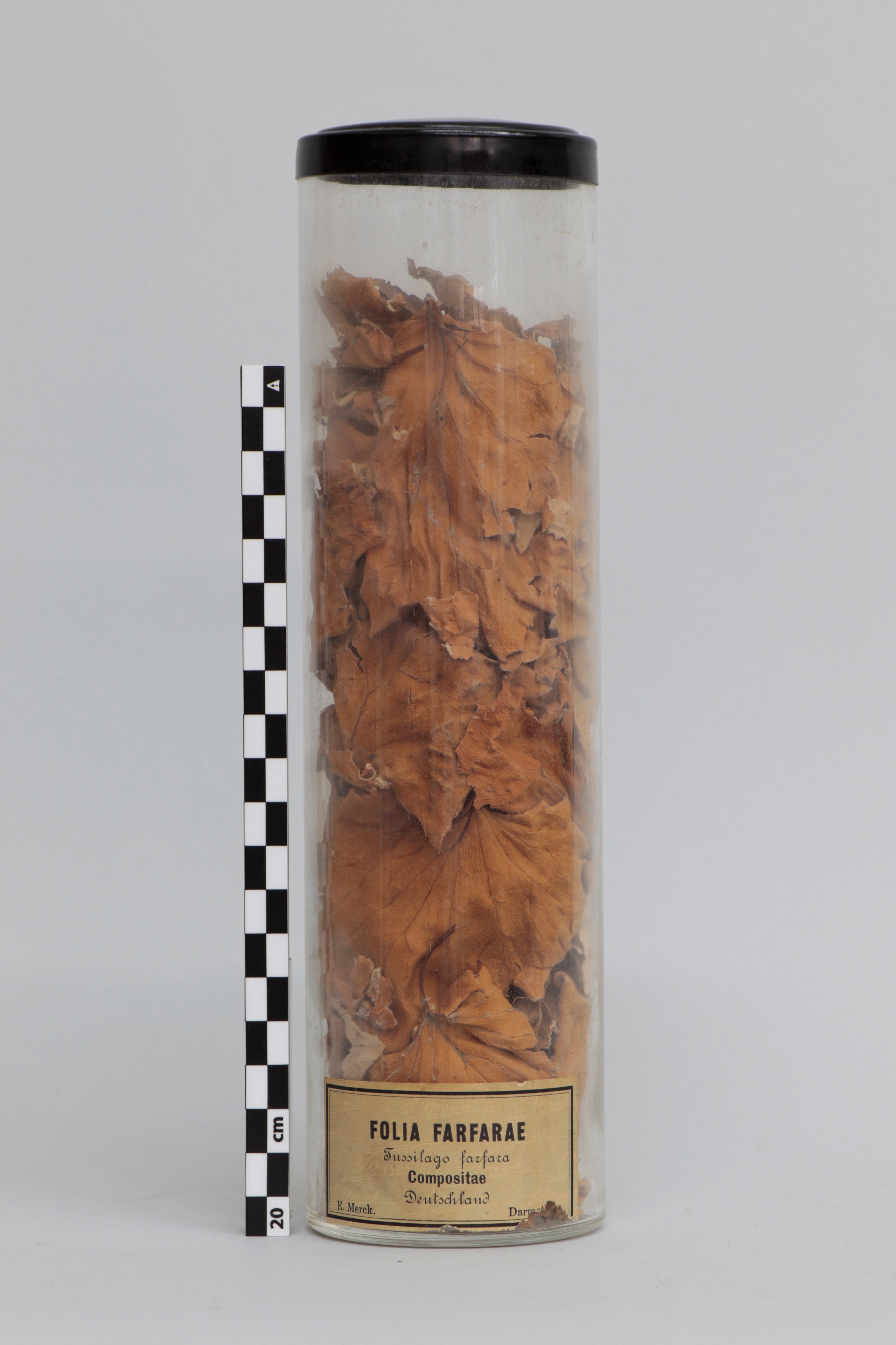 Bote de vidrio cilíndrico que contiene hojas de Tussilago farfara. En el exterior del bote lleva adherida una etiqueta rectangular de papel escrita a máquina, donde se contempla el nombre de la sustancia contenida, su lugar de origen y la empresa que lo ha fabricado (E. Merck con sede en Darmstadt, Alemania). La tapa del bote es de un plástico rígido de color negro.