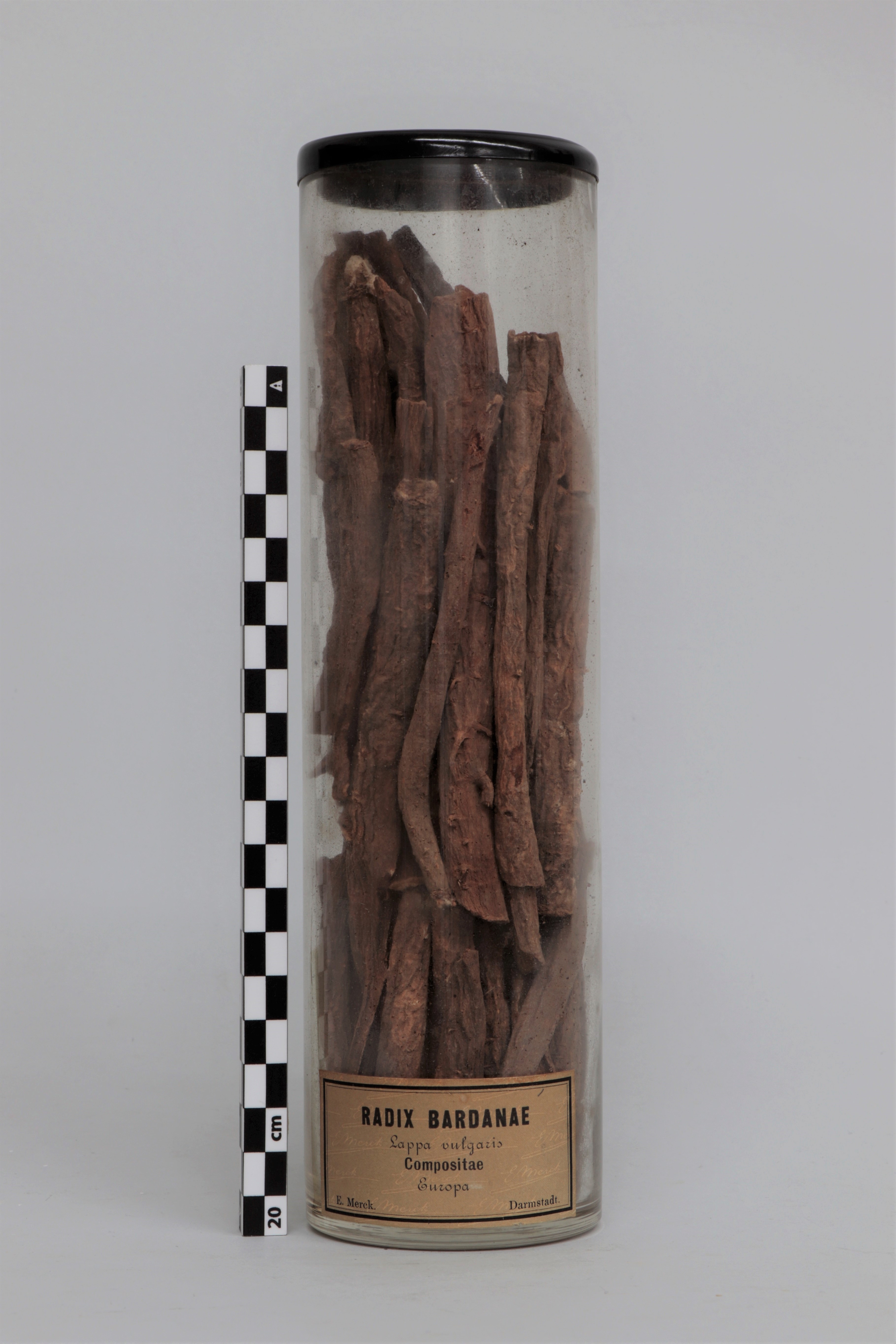 Bote de vidrio cilíndrico que contiene raíces de Arctium lappa, conocida comúnmente como lampazo. En el exterior del bote lleva adherida una etiqueta rectangular de papel escrita a máquina, donde se contempla el nombre de la sustancia contenida, su lugar de origen y la empresa que lo ha fabricado (E. Merck con sede en Darmstadt, Alemania). La tapa del bote es de un plástico rígido de color negro.