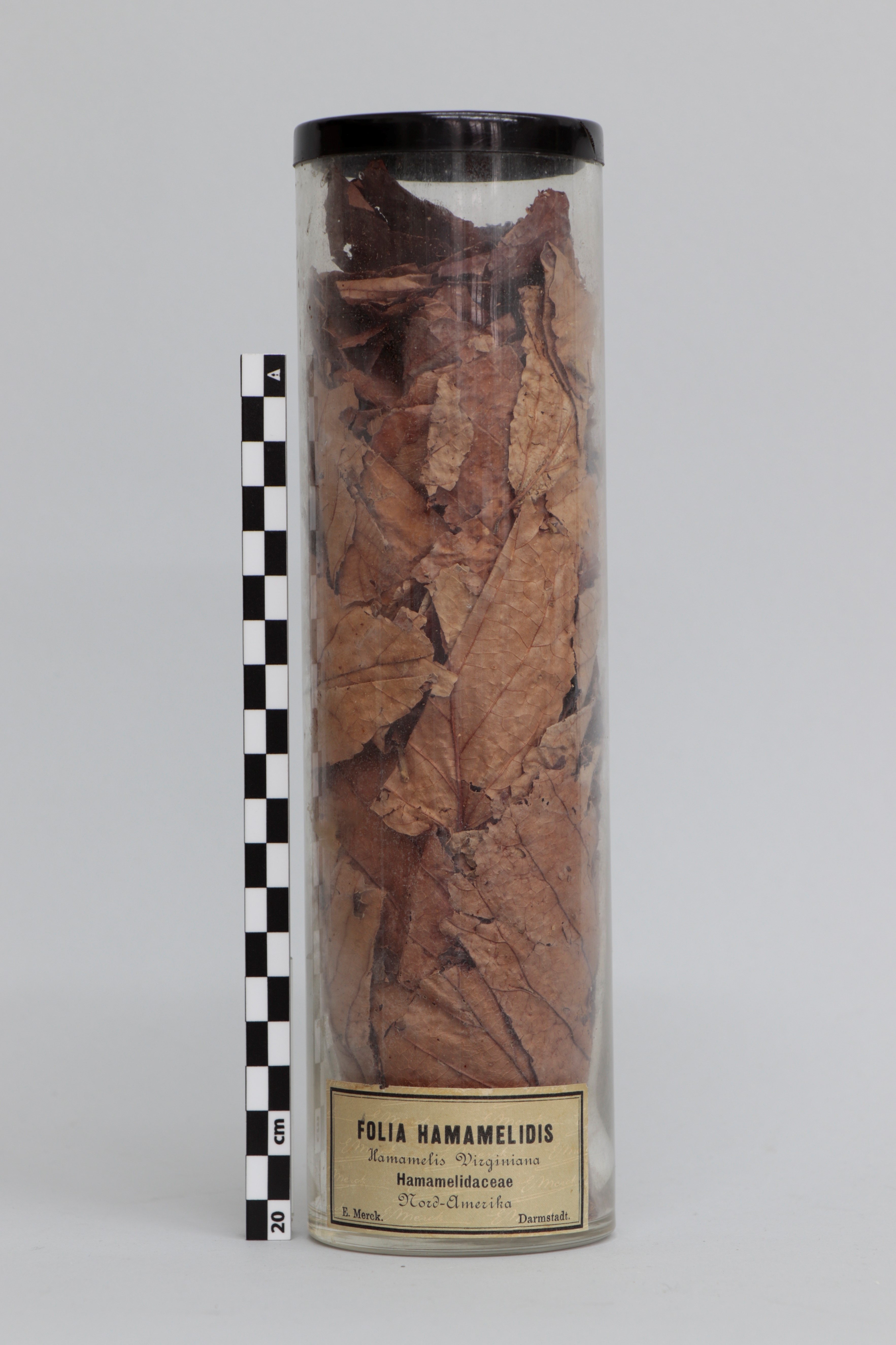 Bote de vidrio cilíndrico que contiene hojas de Hamamelis virginiana, comúnmente conocido como avellano de bruja. En el exterior del bote lleva adherida una etiqueta rectangular de papel escrita a máquina, donde se contempla el nombre de la sustancia contenida, su lugar de origen y la empresa que lo ha fabricado (E. Merck con sede en Darmstadt, Alemania). La tapa del bote es de un plástico rígido de color negro.