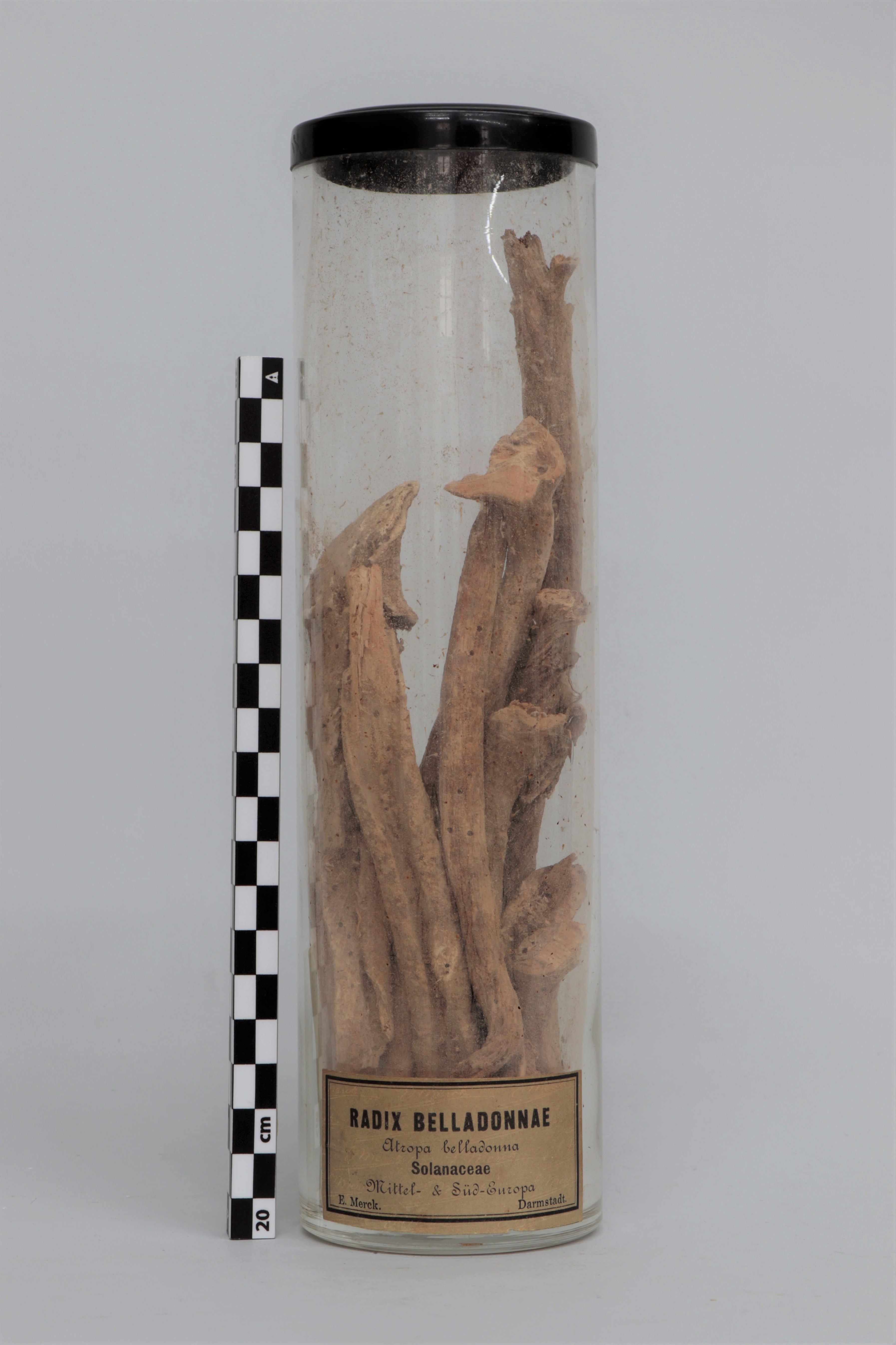 Bote de vidrio cilíndrico que contiene raíces de Atropa belladonna. En el exterior del bote lleva adherida una etiqueta rectangular de papel escrita a máquina, donde se contempla el nombre de la sustancia contenida, su lugar de origen y la empresa que lo ha fabricado (E. Merck con sede en Darmstadt, Alemania). La tapa del bote es de un plástico rígido de color negro.
