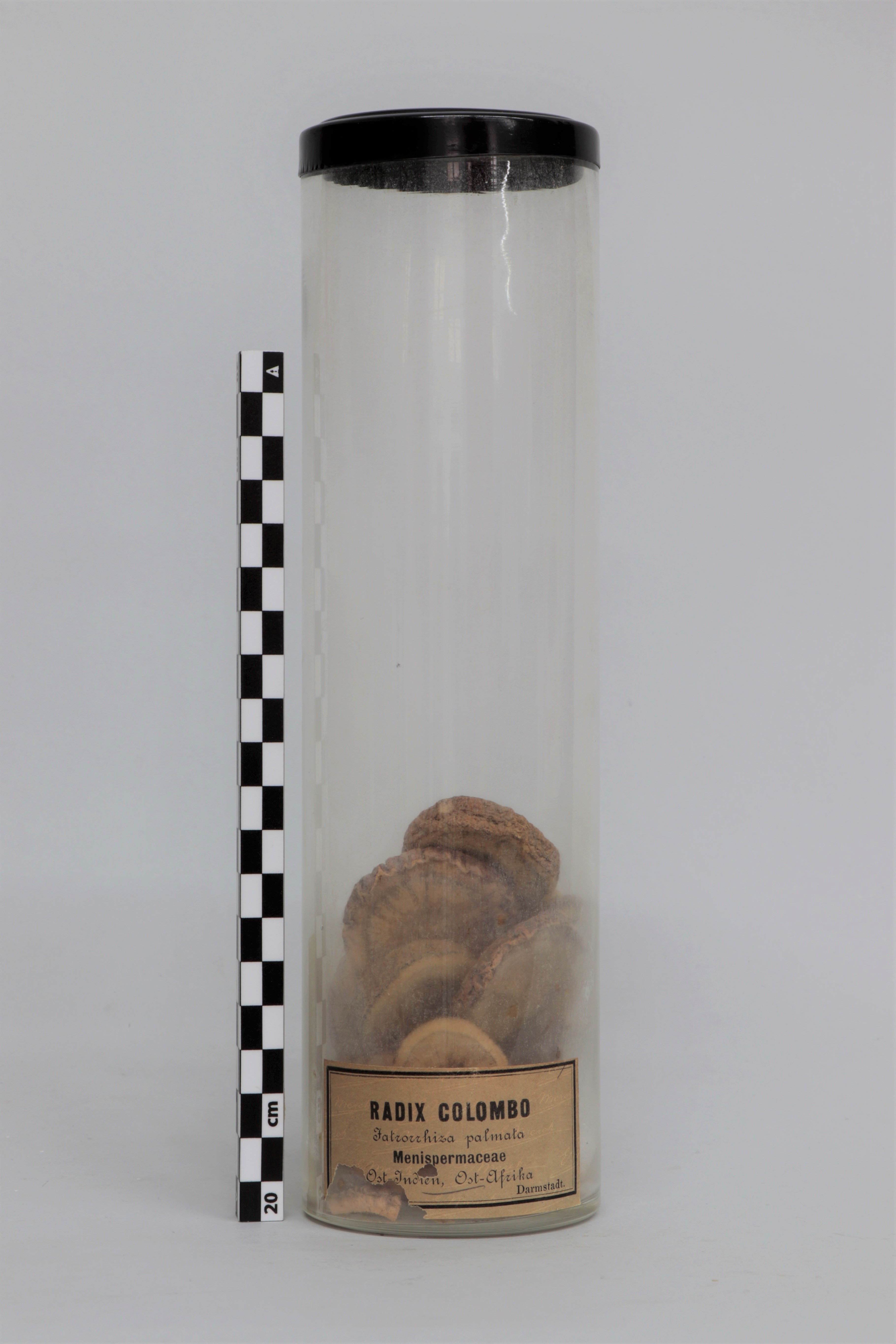 Bote de vidrio cilíndrico que contiene raíces de Cocculus palmatus, comúnmente conocido como colombo. En el exterior del bote lleva adherida una etiqueta rectangular de papel escrita a máquina, donde se contempla el nombre de la sustancia contenida, su lugar de origen y la empresa que lo ha fabricado (E. Merck con sede en Darmstadt, Alemania). La tapa del bote es de un plástico rígido de color negro.