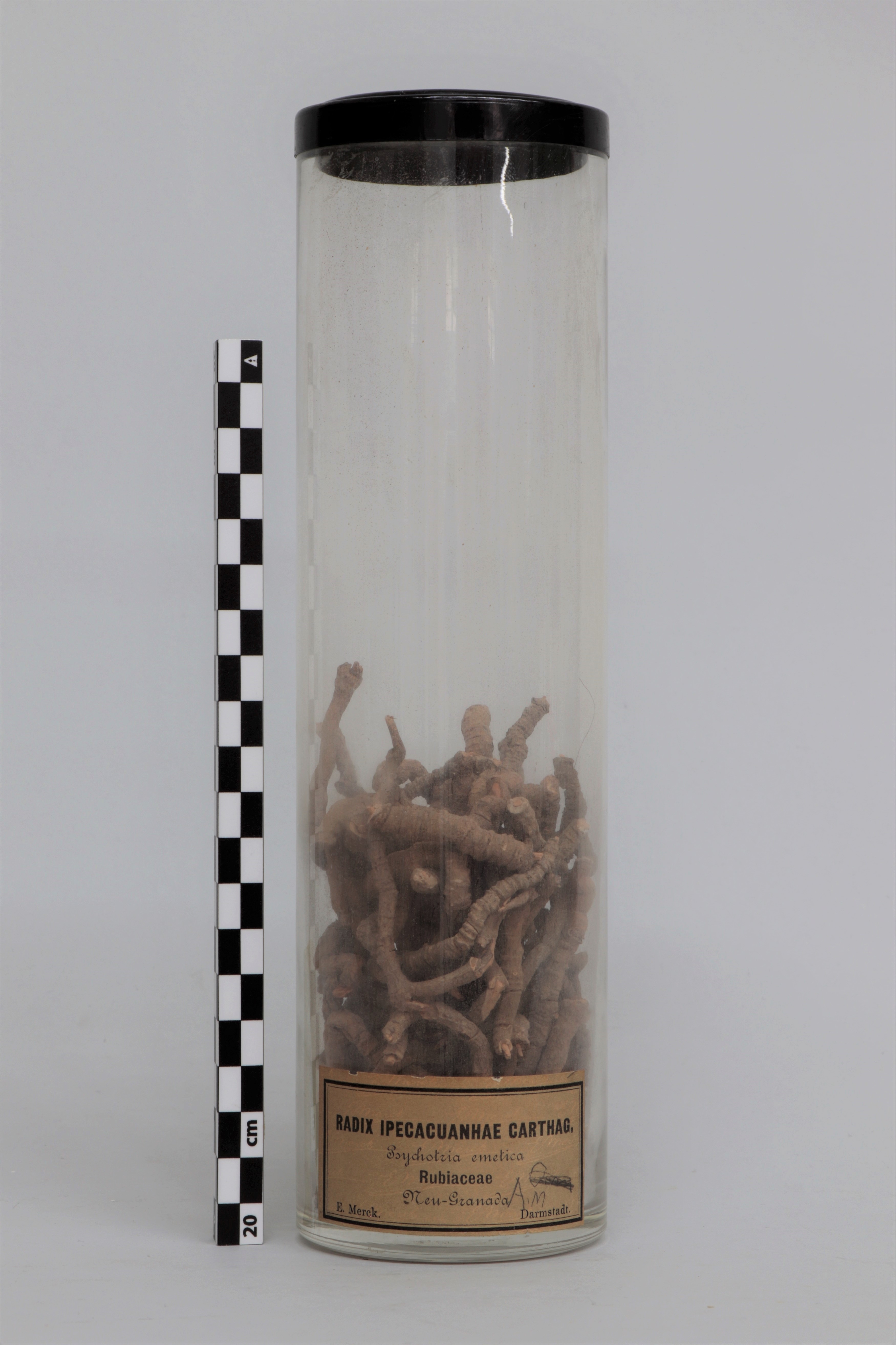 Bote de vidrio cilíndrico que contiene raíces de Ronabea emetica. En el exterior del bote lleva adherida una etiqueta rectangular de papel escrita a máquina, donde se contempla el nombre de la sustancia contenida, su lugar de origen y la empresa que lo ha fabricado (E. Merck con sede en Darmstadt, Alemania). La tapa del bote es de un plástico rígido de color negro.