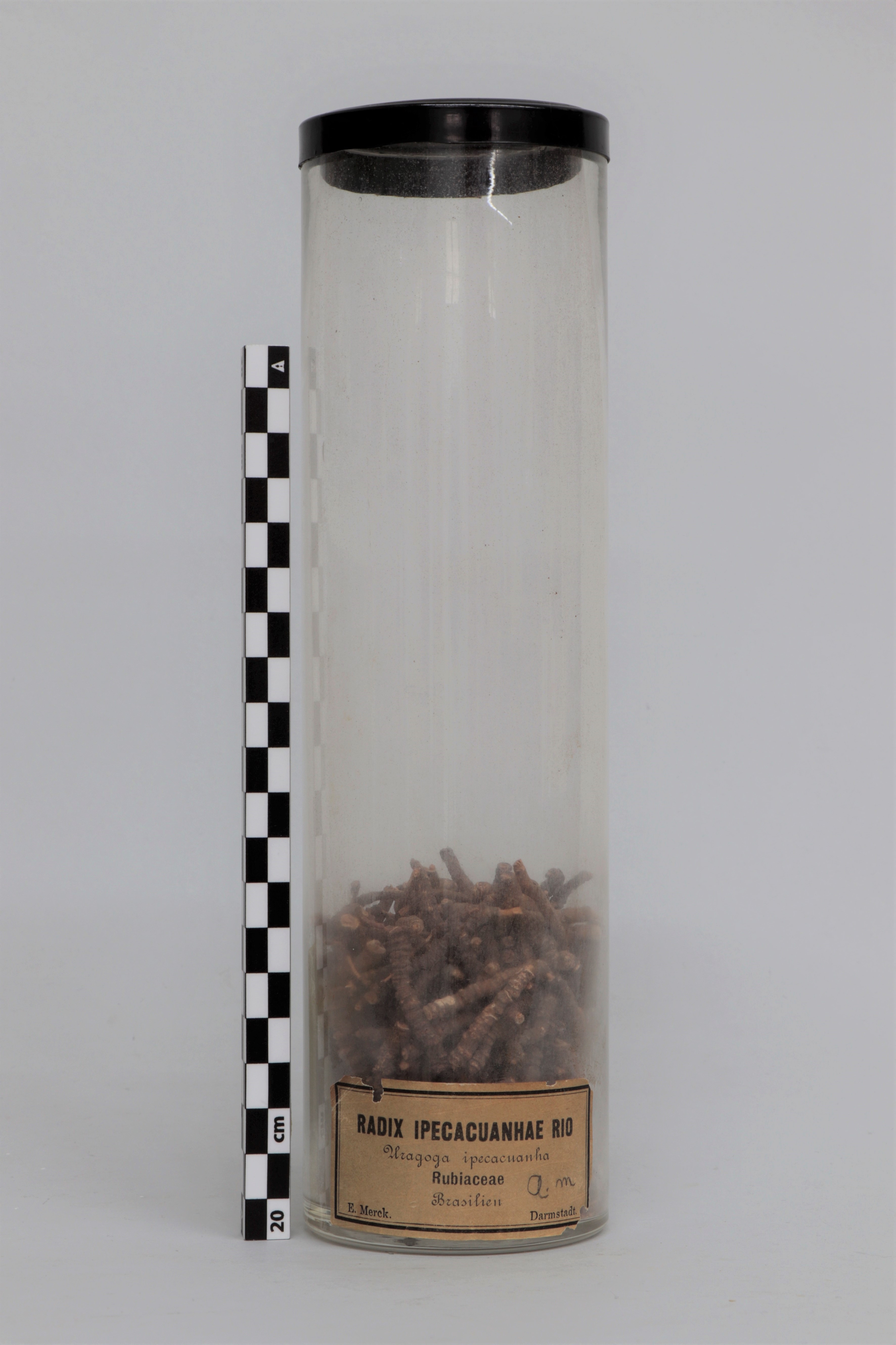 Bote de vidrio cilíndrico que contiene raíces de Carapichea ipecacuanha, conocida comúnmente como ipecacuana. En el exterior del bote lleva adherida una etiqueta rectangular de papel escrita a máquina, donde se contempla el nombre de la sustancia contenida, su lugar de origen y la empresa que lo ha fabricado (E. Merck con sede en Darmstadt, Alemania). La tapa del bote es de un plástico rígido de color negro.