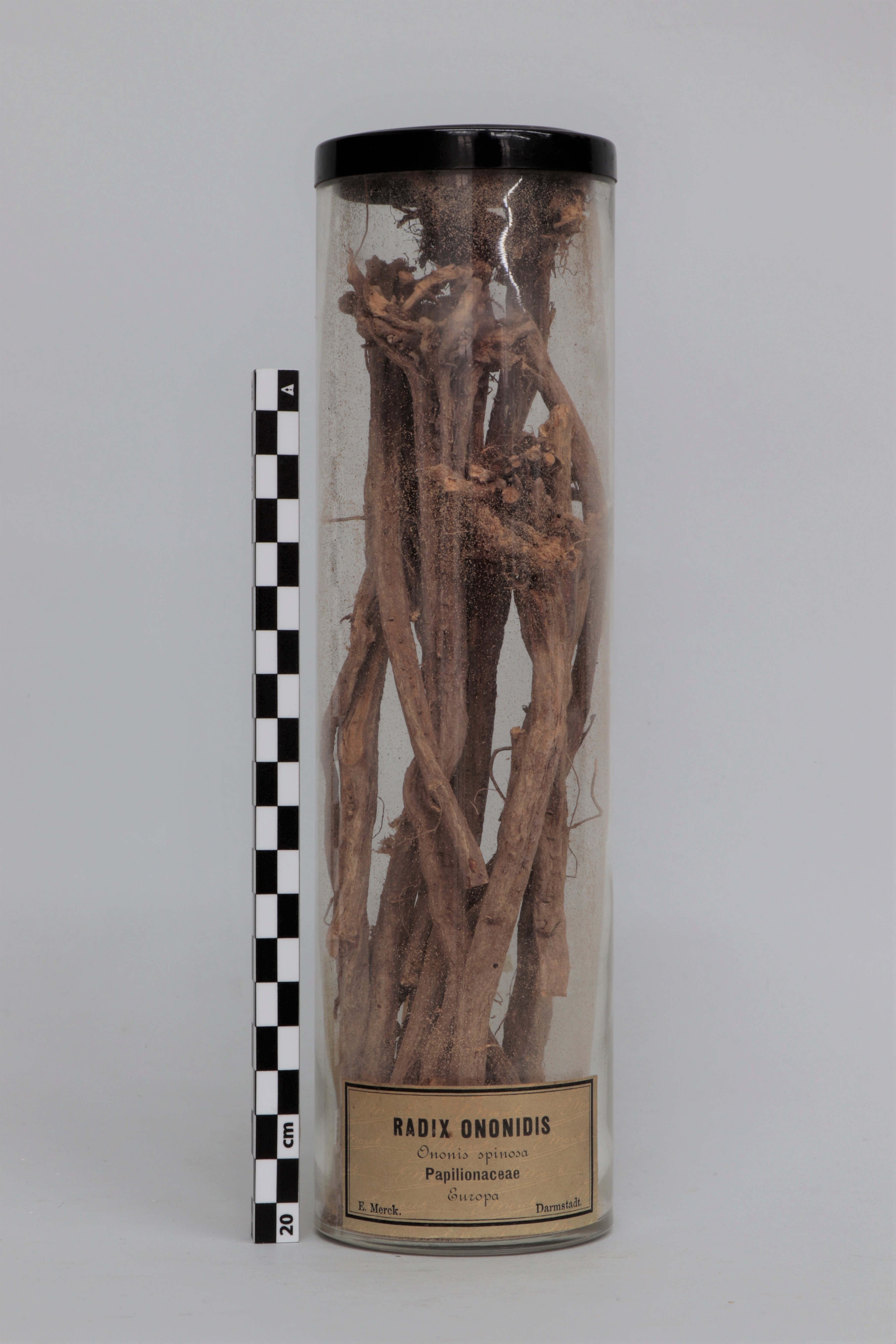 Bote de vidrio cilíndrico que contiene raíces de Ononis spinosa, comúnmente conocida como asnillo o gatuña. En el exterior del bote lleva adherida una etiqueta rectangular de papel escrita a máquina, donde se contempla el nombre de la sustancia contenida, su lugar de origen y la empresa que lo ha fabricado (E. Merck con sede en Darmstadt, Alemania). La tapa del bote es de un plástico rígido de color negro.