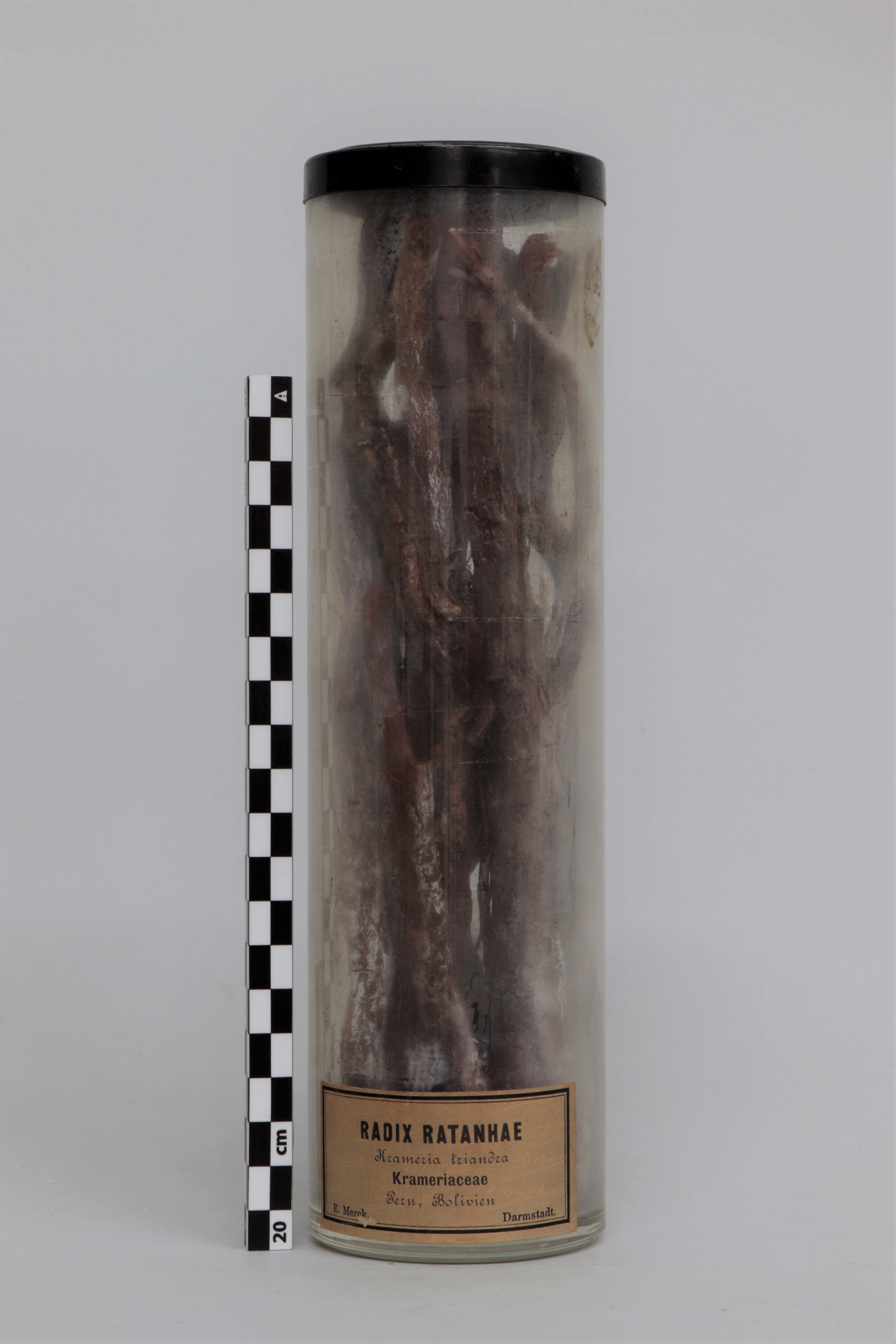 Bote de vidrio cilíndrico que contiene raíces de Krameria lappacea, conocida como Ratania. En el exterior del bote lleva adherida una etiqueta rectangular de papel escrita a máquina, donde se contempla el nombre de la sustancia contenida, su lugar de origen y la empresa que lo ha fabricado (E. Merck con sede en Darmstadt, Alemania). La tapa del bote es de un plástico rígido de color negro.